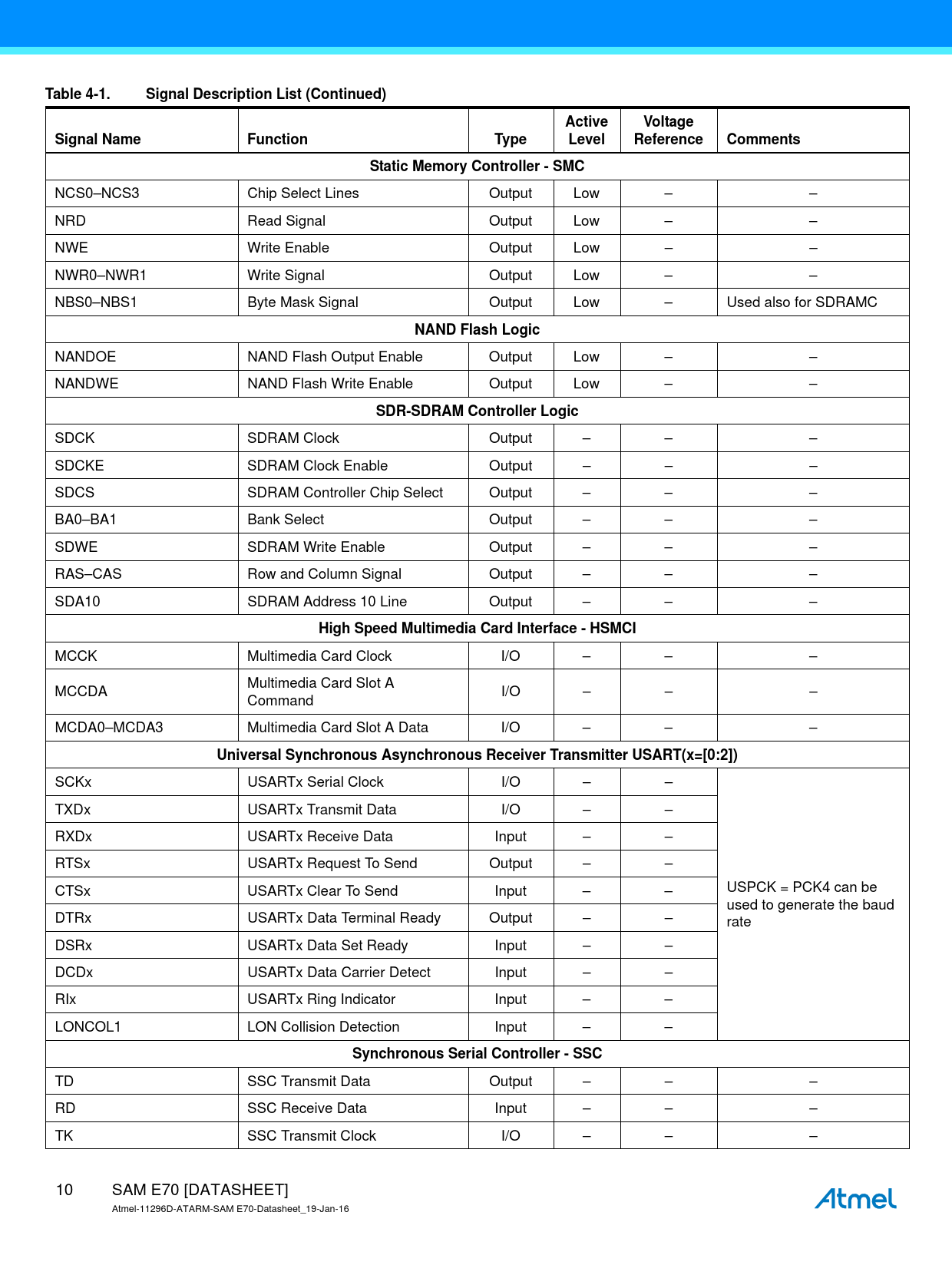 Table 4-1. Signal Description List (Continued) Active Voltage Signal Name Function Type Level Reference Comments Static Memory Controller - SMC