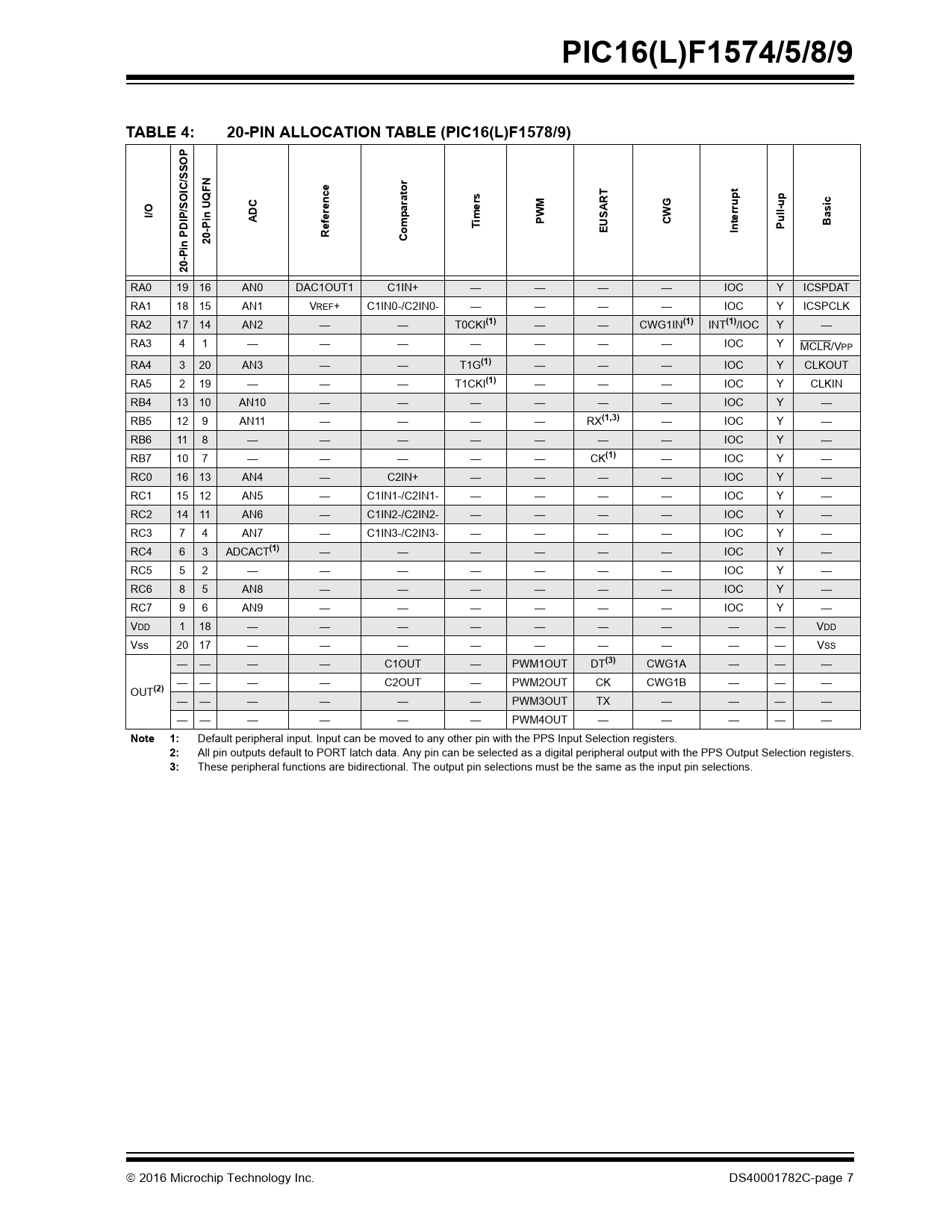 PIC16(L)F1574/5/8/9. TABLE 4:. 20-PIN ALLOCATION TABLE (PIC16(L)F1578/9). P O S C/S. UQF. sic. I/O. rru. ll-u. ADC. feren. ime. CWG. m o. EUSART