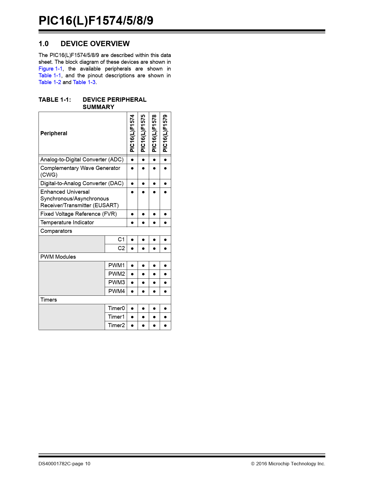 PIC16(L)F1574/5/8/9. 1.0. DEVICE OVERVIEW. TABLE 1-1:. DEVICE PERIPHERAL SUMMARY. Peripheral. (L)F15. PIC16