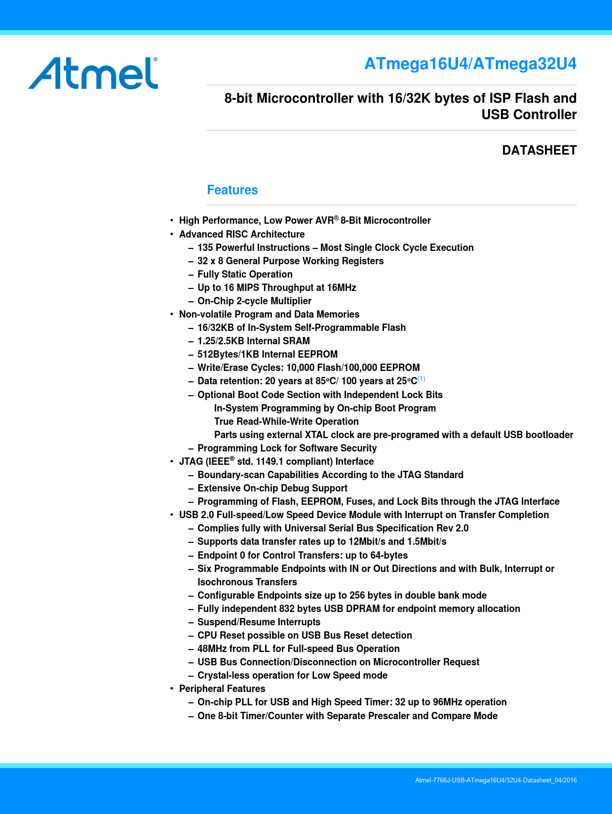 link to page 2 ATmega16U4/ATmega32U48-bit Microcontroller with 16/32K bytes of ISP Flash andUSB ControllerDATASHEETFeatures • High Performance, Low Power AVR ® 8-Bit Microcontroller • Advanced RISC Architecture– 135 Powerful Instructions – Most Single Clock Cycle Execution– 32 x 8 General Purpose Working Registers– Fully Static Operation– Up to 16 MIPS Throughput at 16MHz– On-Chip 2-cycle Multiplier • Non-volatile Program and Data Memories– 16/32KB of In-System Self-Programmable Flash– 1.25/2.5KB Internal SRAM– 512Bytes/1KB Internal EEPROM– Write/Erase Cycles: 10,000 Flash/100,000 EEPROM– Data retention: 20 years at 85C/ 100 years at 25C (1) – Optional Boot Code Section with Independent Lock BitsIn-System Programming by On-chip Boot ProgramTrue Read-While-Write OperationParts using external XTAL clock are pre-programed with a default USB bootloader– Programming Lock for Software Security • JTAG (IEEE® std. 1149.1 compliant) Interface– Boundary-scan Capabilities According to the JTAG Standard– Extensive On-chip Debug Support– Programming of Flash, EEPROM, Fuses, and Lock Bits through the JTAG Interface • USB 2.0 Full-speed/Low Speed Device Module with Interrupt on Transfer Completion– Complies fully with Universal Serial Bus Specification Rev 2.0– Supports data transfer rates up to 12Mbit/s and 1.5Mbit/s– Endpoint 0 for Control Transfers: up to 64-bytes– Six Programmable Endpoints with IN or Out Directions and with Bulk, Interrupt orIsochronous Transfers– Configurable Endpoints size up to 256 bytes in double bank mode– Fully independent 832 bytes USB DPRAM for endpoint memory allocation– Suspend/Resume Interrupts– CPU Reset possible on USB Bus Reset detection– 48MHz from PLL for Full-speed Bus Operation– USB Bus Connection/Disconnection on Microcontroller Request– Crystal-less operation for Low Speed mode • Peripheral Features– On-chip PLL for USB and High Speed Timer: 32 up to 96MHz operation– One 8-bit Timer/Counter with Separate Prescaler and Compare Mode Atmel-7766J-USB-ATmega16U4/32U4-Datasheet_04/2016 Document Outline Features 1. Pin Configurations 2. Overview 2.1 Block Diagram 2.2 Pin Descriptions 2.2.1 VCC 2.2.2 GND 2.2.3 Port B (PB7..PB0) 2.2.4 Port C (PC7,PC6) 2.2.5 Port D (PD7..PD0) 2.2.6 Port E (PE6,PE2) 2.2.7 Port F (PF7..PF4, PF1,PF0) 2.2.8 D- 2.2.9 D+ 2.2.10 UGND 2.2.11 UVCC 2.2.12 UCAP 2.2.13 VBUS 2.2.14 RESET 2.2.15 XTAL1 2.2.16 XTAL2 2.2.17 AVCC 2.2.18 AREF 3. About 3.1 Disclaimer 3.2 Resources 3.3 Code Examples 3.4 Data Retention 4. AVR CPU Core 4.1 Introduction 4.2 Architectural Overview 4.3 ALU – Arithmetic Logic Unit 4.4 Status Register 4.5 General Purpose Register File 4.5.1 The X-register, Y-register, and Z-register 4.6 Stack Pointer 4.6.1 Extended Z-pointer Register for ELPM/SPM - RAMPZ 4.7 Instruction Execution Timing 4.8 Reset and Interrupt Handling 4.8.1 Interrupt Response Time 5. AVR Memories 5.1 In-System Reprogrammable Flash Program Memory 5.2 SRAM Data Memory 5.2.1 Data Memory Access Times 5.3 EEPROM Data Memory 5.3.1 EEPROM Read/Write Access 5.3.2 The EEPROM Address Register – EEARH and EEARL 5.3.3 The EEPROM Data Register – EEDR 5.3.4 The EEPROM Control Register – EECR 5.3.5 Preventing EEPROM Corruption 5.4 I/O Memory 5.4.1 General Purpose I/O Registers 5.4.2 General Purpose I/O Register 2 – GPIOR2 5.4.3 General Purpose I/O Register 1 – GPIOR1 5.4.4 General Purpose I/O Register 0 – GPIOR0 6. System Clock and Clock Options 6.1 Clock Systems and their Distribution 6.1.1 CPU Clock – clkCPU 6.1.2 I/O Clock – clkI/O 6.1.3 Flash Clock – clkFLASH 6.1.4 ADC Clock – clkADC 6.1.5 PLL Prescaler Clock – clkPllPresc 6.1.6 PLL Output Clock – clkPll 6.1.7 High-Speed Timer Clock– clkTMR 6.1.8 USB Clock – clkUSB 6.2 Clock Sources 6.2.1 Default Clock Source ATmega16U4 and ATmega32U4 6.2.2 Default Clock Source ATmega16U4RC and ATmega32U4RC 6.2.3 Clock Startup Sequence 6.3 Low Power Crystal Oscillator 6.4 Low Frequency Crystal Oscillator 6.5 Calibrated Internal RC Oscillator 6.5.1 Oscillator Calibration Register – OSCCAL 6.5.2 Oscillator Control Register – RCCTRL 6.6 External Clock 6.7 Clock Switch 6.7.1 Example of use 6.8 Clock Output Buffer 6.8.1 System Clock Prescaler 6.9 PLL 6.9.1 Internal PLL 6.10 Clock switch Algorithm 6.10.1 Switch from External Clock to RC Clock 6.10.2 Switch from RC Clock to External Clock 6.11 Register Description 6.11.1 CLKSEL0 – Clock Selection Register 0 6.11.2 CLKSEL1 – Clock Selection Register 1 6.11.3 CLKSTA – Clock Status Register 6.11.4 CLKPR – Clock Prescaler Register 6.11.5 PLL Control and Status Register – PLLCSR 6.11.6 PLL Frequency Control Register – PLLFRQ 7. Power Management and Sleep Modes 7.1 Idle Mode 7.2 ADC Noise Reduction Mode 7.3 Power-down Mode 7.4 Power-save Mode 7.5 Standby Mode 7.6 Extended Standby Mode 7.7 Power Reduction Register 7.8 Minimizing Power Consumption 7.8.1 Analog to Digital Converter 7.8.2 Analog Comparator 7.8.3 Brown-out Detector 7.8.4 Internal Voltage Reference 7.8.5 Watchdog Timer 7.8.6 Port Pins 7.8.7 On-chip Debug System 7.9 Register Description 7.9.1 Sleep Mode Control Register – SMCR 7.9.2 Power Reduction Register 0 - PRR0 7.9.3 Power Reduction Register 1 - PRR1 8. System Control and Reset 8.1 Resetting the AVR 8.2 Reset Sources 8.3 Power-on Reset 8.4 External Reset 8.5 Brown-out Detection 8.6 Watchdog Reset 8.7 USB Reset 8.8 Internal Voltage Reference 8.8.1 Voltage Reference Enable Signals and Start-up Time 8.9 Watchdog Timer 8.10 Register Description 8.11 MCU Status Register – MCUSR 8.11.1 Watchdog Timer Control Register - WDTCSR 9. Interrupts 9.1 Interrupt Vectors in ATmega16U4/ATmega32U4 9.1.1 Moving Interrupts Between Application and Boot Space 9.2 Register Description 9.2.1 MCU Control Register – MCUCR 10. I/O-Ports 10.1 Introduction 10.2 Ports as General Digital I/O 10.2.1 Configuring the Pin 10.2.2 Toggling the Pin 10.2.3 Switching Between Input and Output 10.2.4 Reading 