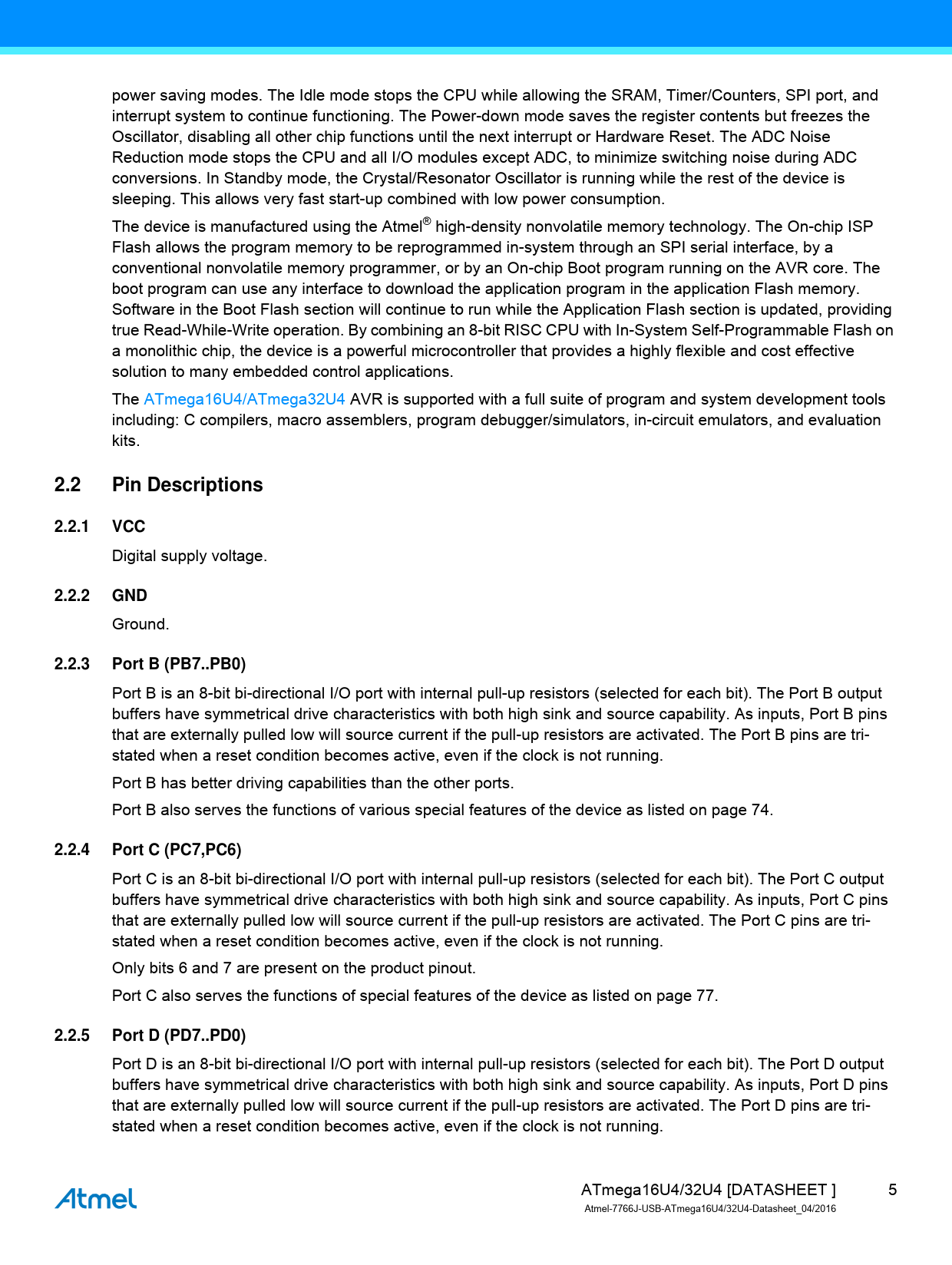 2.2. Pin Descriptions. 2.2.1. VCC. 2.2.2. GND. 2.2.3. Port B (PB7..PB0). 2.2.4. Port C (PC7,PC6). 2.2.5. Port D (PD7..PD0)