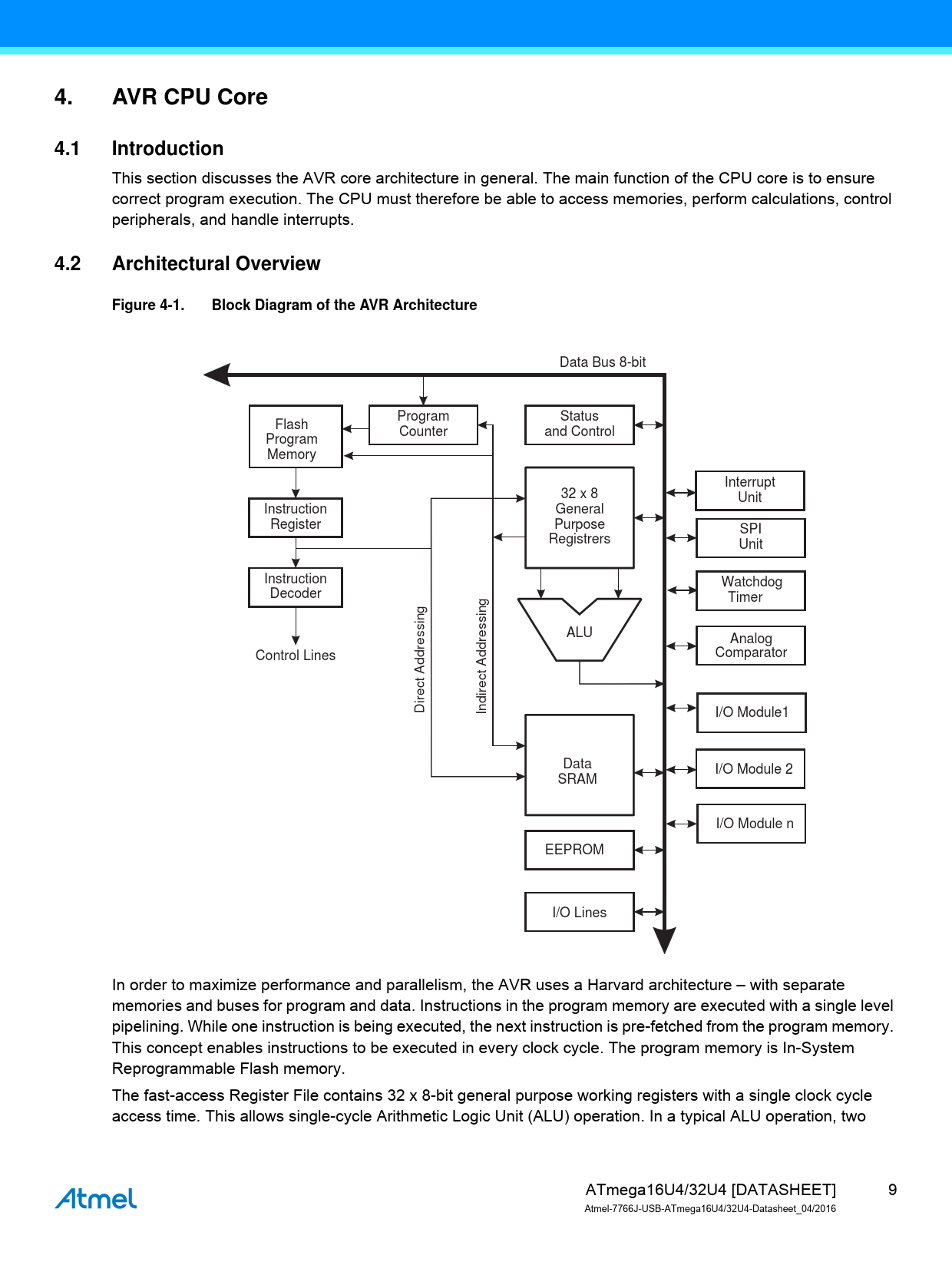 Seiten / Seite438 / 9 — AVR CPU Core. 4.1. Introduction. 4.2. Architectural Overview. Figure 4-1. …