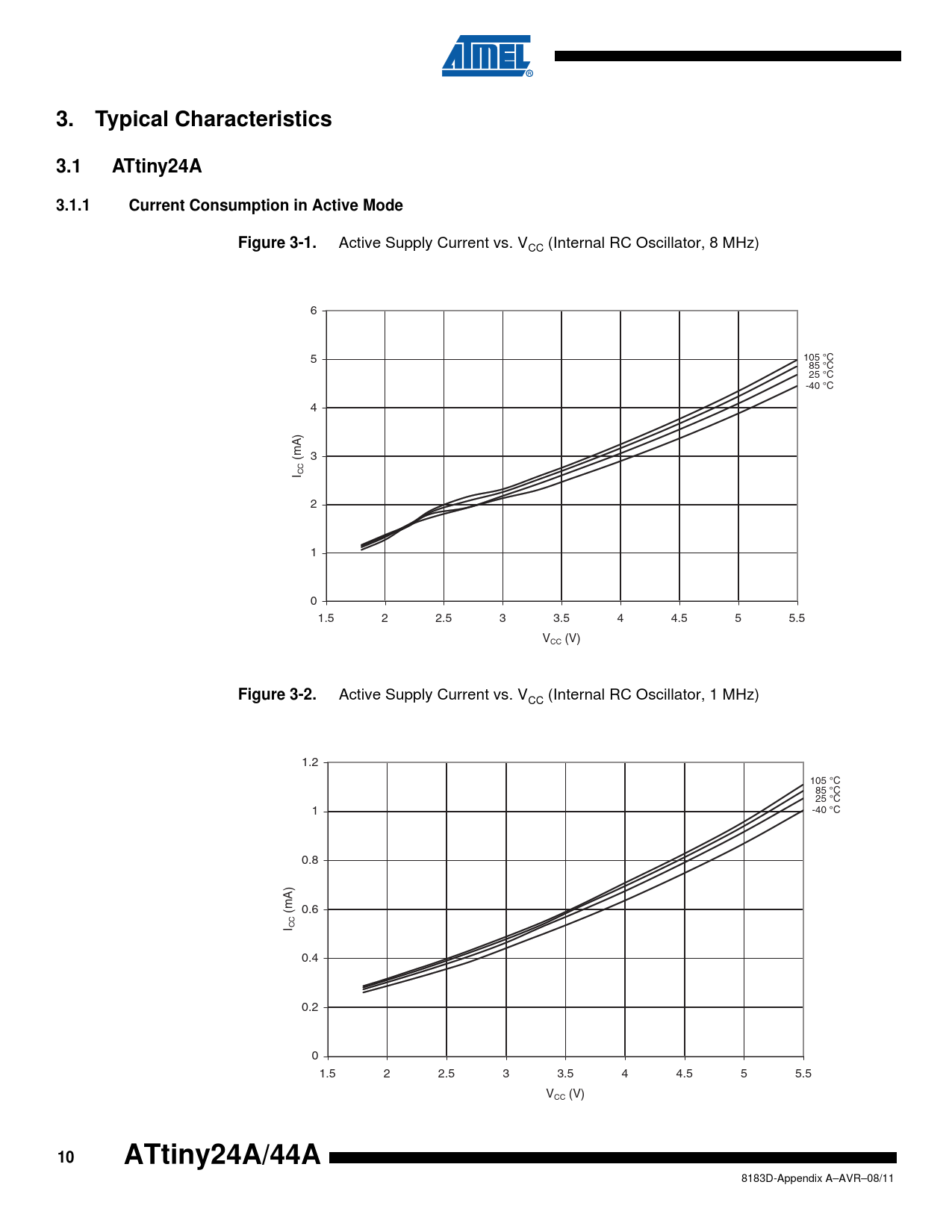 Typical Characteristics. 3.1. ATtiny24A. 3.1.1. Current Consumption in Active Mode. Figure 3-1. Figure 3-2. ATtiny24A/44A