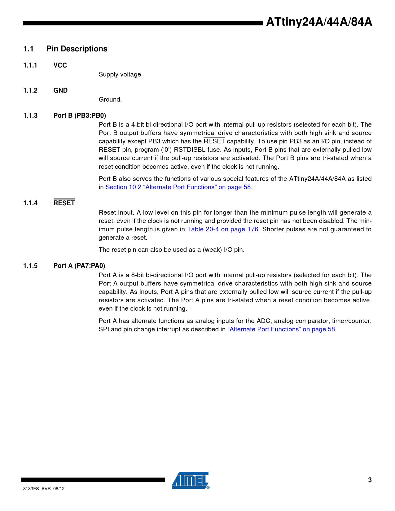 ATtiny24A/44A/84A1.1Pin Descriptions1.1.1VCC Supply voltage. 1.1.2GND Ground. 1.1.3Port B (PB3:PB0) Port B is a 4-bit bi-directional I/O port with internal pull-up resistors (selected for each bit). The Port B output buffers have symmetrical drive characteristics with both high sink and source capability except PB3 which has the RESET capability. To use pin PB3 as an I/O pin, instead of RESET pin, program (‘0’) RSTDISBL fuse. As inputs, Port B pins that are externally pulled low will source current if the pull-up resistors are activated. The Port B pins are tri-stated when a reset condition becomes active, even if the clock is not running. Port B also serves the functions of various special features of the ATtiny24A/44A/84A as listed in Section 10.2 “Alternate Port Functions” on page 58. 1.1.4RESET Reset input. A low level on this pin for longer than the minimum pulse length will generate a reset, even if the clock is not running and provided the reset pin has not been disabled. The min- imum pulse length is given in Table 20-4 on page 176. Shorter pulses are not guaranteed to generate a reset. The reset pin can also be used as a (weak) I/O pin. 1.1.5Port A (PA7:PA0) Port A is a 8-bit bi-directional I/O port with internal pull-up resistors (selected for each bit). The Port A output buffers have symmetrical drive characteristics with both high sink and source capability. As inputs, Port A pins that are externally pulled low will source current if the pull-up resistors are activated. The Port A pins are tri-stated when a reset condition becomes active, even if the clock is not running. Port A has alternate functions as analog inputs for the ADC, analog comparator, timer/counter, SPI and pin change interrupt as described in “Alternate Port Functions” on page 58. 3 8183FS–AVR–06/12 Document Outline Features 1. Pin Configurations 1.1 Pin Descriptions 1.1.1 VCC 1.1.2 GND 1.1.3 Port B (PB3:PB0) 1.1.4 RESET 1.1.5 Port A (PA7:PA0) 2. Overview 3. General Information 3.1 Resources 3.2 Code Examples 3.3 Capacitive Touch Sensing 3.4 Data Retention 3.5 Disclaimer 4. Register Summary 5. Instruction Set Summary 6. Ordering Information 6.1 ATtiny24A 6.2 ATtiny44A 6.3 ATtiny84A 7. Packaging Information 7.1 14S1 7.2 14P3 7.3 15CC1 7.4 20M1 7.5 20M2 8. Errata 8.1 ATtiny24A 8.1.1 Rev. H 8.1.2 Rev. G 8.1.3 Rev. F 8.2 ATtiny44A 8.2.1 Rev. G 8.2.2 Rev. F 8.2.3 Rev. E 8.3 ATtiny84A 8.3.1 Rev. C 9. Datasheet Revision History 9.1 Rev. 8183F – 06/12 9.2 Rev. 8183E – 01/12 9.3 Rev. 8183D – 04/11 9.4 Rev. 8183C – 03/11 9.5 Rev. 8183B – 03/10 9.6 Rev. 8183A – 12/08