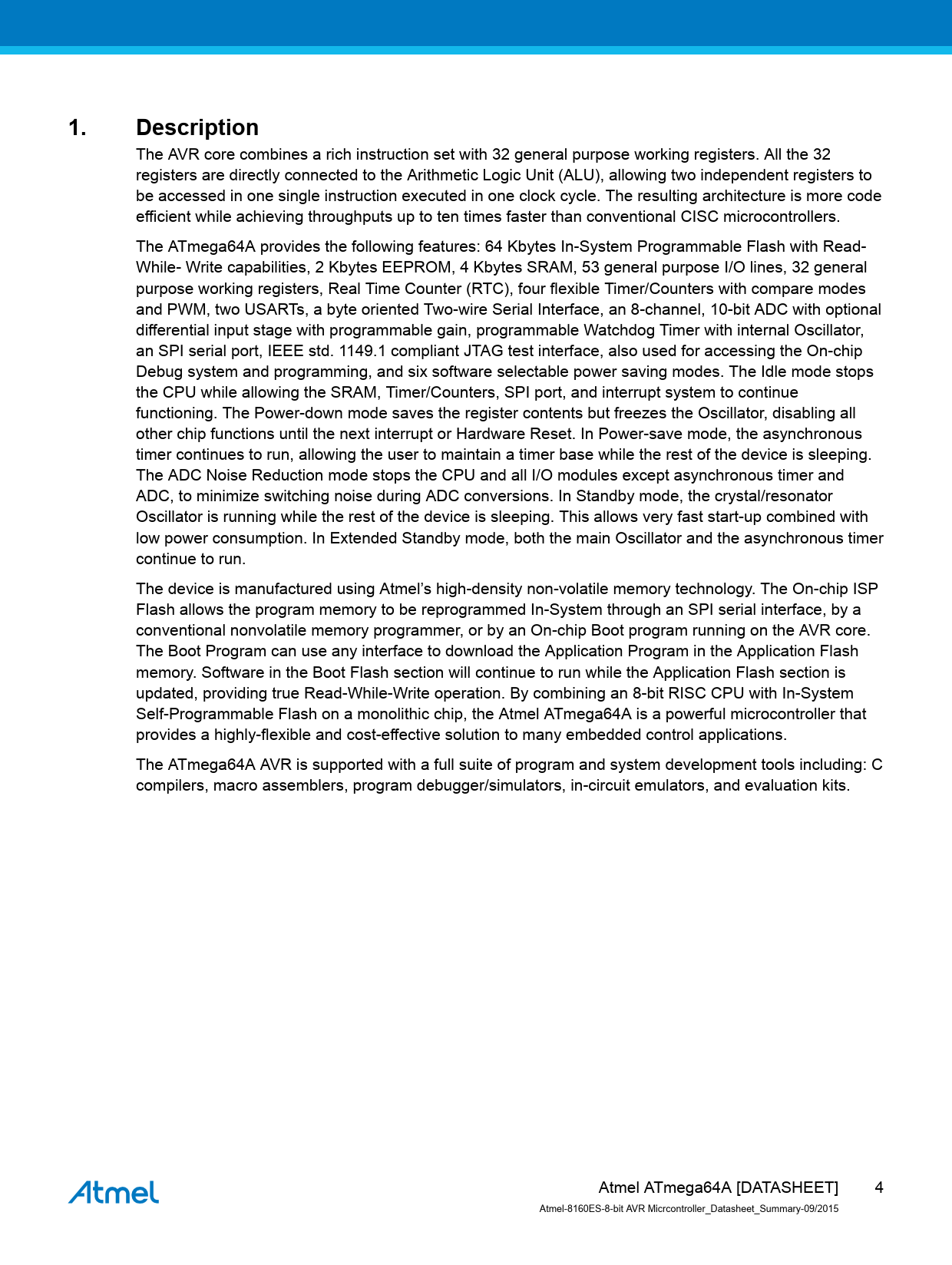 1.Description The AVR core combines a rich instruction set with 32 general purpose working registers. All the 32 registers are directly connected to the Arithmetic Logic Unit (ALU), allowing two independent registers to be accessed in one single instruction executed in one clock cycle. The resulting architecture is more code efficient while achieving throughputs up to ten times faster than conventional CISC microcontrollers. The ATmega64A provides the following features: 64 Kbytes In-System Programmable Flash with Read- While- Write capabilities, 2 Kbytes EEPROM, 4 Kbytes SRAM, 53 general purpose I/O lines, 32 general purpose working registers, Real Time Counter (RTC), four flexible Timer/Counters with compare modes and PWM, two USARTs, a byte oriented Two-wire Serial Interface, an 8-channel, 10-bit ADC with optional differential input stage with programmable gain, programmable Watchdog Timer with internal Oscillator, an SPI serial port, IEEE std. 1149.1 compliant JTAG test interface, also used for accessing the On-chip Debug system and programming, and six software selectable power saving modes. The Idle mode stops the CPU while allowing the SRAM, Timer/Counters, SPI port, and interrupt system to continue functioning. The Power-down mode saves the register contents but freezes the Oscillator, disabling all other chip functions until the next interrupt or Hardware Reset. In Power-save mode, the asynchronous timer continues to run, allowing the user to maintain a timer base while the rest of the device is sleeping. The ADC Noise Reduction mode stops the CPU and all I/O modules except asynchronous timer and ADC, to minimize switching noise during ADC conversions. In Standby mode, the crystal/resonator Oscillator is running while the rest of the device is sleeping. This allows very fast start-up combined with low power consumption. In Extended Standby mode, both the main Oscillator and the asynchronous timer continue to run. The device is manufactured using Atmel’s high-density non-volatile memory technology. The On-chip ISP Flash allows the program memory to be reprogrammed In-System through an SPI serial interface, by a conventional nonvolatile memory programmer, or by an On-chip Boot program running on the AVR core. The Boot Program can use any interface to download the Application Program in the Application Flash memory. Software in the Boot Flash section will continue to run while the Application Flash section is updated, providing true Read-While-Write operation. By combining an 8-bit RISC CPU with In-System Self-Programmable Flash on a monolithic chip, the Atmel ATmega64A is a powerful microcontroller that provides a highly-flexible and cost-effective solution to many embedded control applications. The ATmega64A AVR is supported with a full suite of program and system development tools including: C compilers, macro assemblers, program debugger/simulators, in-circuit emulators, and evaluation kits. Atmel ATmega64A [DATASHEET] 4 Atmel-8160ES-8-bit AVR Micrcontroller_Datasheet_Summary-09/2015 Document Outline Introduction Features Table of Contents 1. Description 2. Configuration Summary 3. Ordering Information 4. Block Diagram 5. ATmega103 and ATmega64A Compatibility 5.1. ATmega103 Compatibility Mode 6. Pin Configurations 6.1. Pin Descriptions 6.1.1. VCC 6.1.2. GND 6.1.3. Port A (PA7:PA0) 6.1.4. Port B (PB7:PB0) 6.1.5. Port C (PC7:PC0) 6.1.6. Port D (PD7:PD0) 6.1.7. Port E (PE7:PE0) 6.1.8. Port F (PF7:PF0) 6.1.9. Port G (PG4:PG0) 6.1.10. RESET 6.1.11. XTAL1 6.1.12. XTAL2 6.1.13. AVCC 6.1.14. AREF 6.1.15. PEN 7. Resources 8. Data Retention 9. About Code Examples 10. Capacitive Touch Sensing 11. Packaging Information 11.1. 64A 11.2. 64M1 12. Errata 12.1. ATmega64A Rev. D