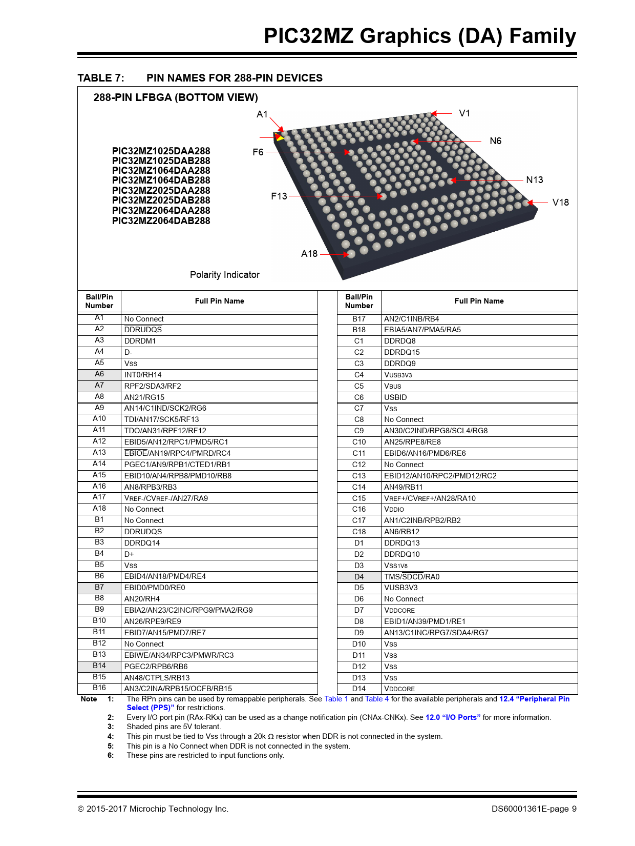 PIC32MZ Graphics (DA) Family. TABLE 7:. PIN NAMES FOR 288-PIN DEVICES. 288-PIN LFBGA (BOTTOM VIEW). PIC32MZ1025DAA288
