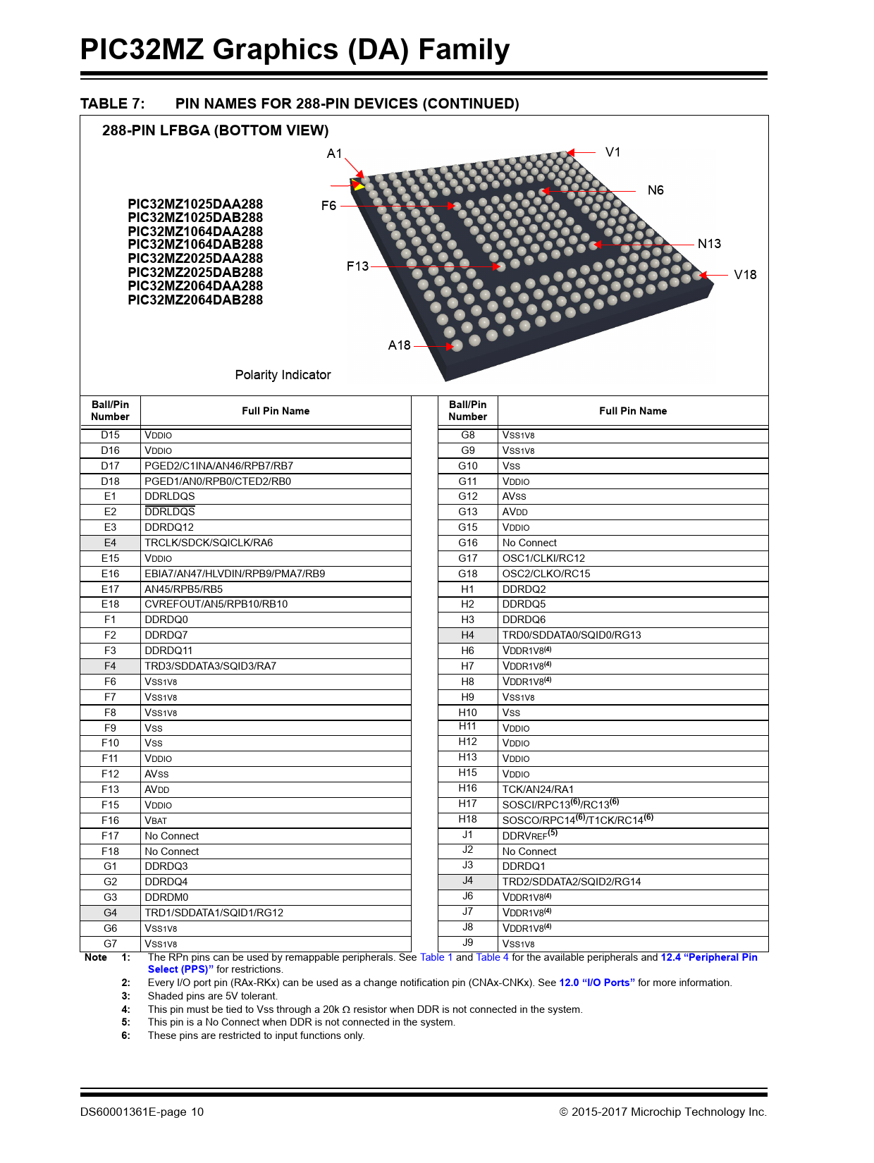 PIC32MZ Graphics (DA) Family. TABLE 7:. PIN NAMES FOR 288-PIN DEVICES (CONTINUED). 288-PIN LFBGA (BOTTOM VIEW)