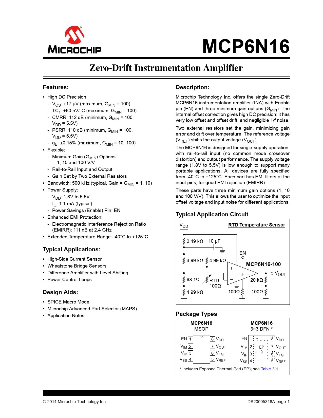 link to page 36 MCP6N16Zero-Drift Instrumentation AmplifierFeatures:Description: • High DC Precision: Microchip Technology Inc. offers the single Zero-Drift - V MCP6N16 instrumentation amplifier (INA) with Enable OS: ±17 µV (maximum, GMIN = 100) - TC pin (EN) and three minimum gain options (GMIN). The 1: ±60 nV/°C (maximum, GMIN = 100) internal offset correction gives high DC precision: it has - CMRR: 112 dB (minimum, GMIN = 100, very low offset and offset drift, and negligible 1/f noise. VDD = 5.5V) - PSRR: 110 dB (minimum, G Two external resistors set the gain, minimizing gain MIN = 100, V error and drift over temperature. The reference voltage DD = 5.5V) (V - g REF) shifts the output voltage (VOUT). E: ±0.15% (maximum, GMIN = 10, 100) • Flexible: The MCP6N16 is designed for single-supply operation, with rail-to-rail input (no common mode crossover - Minimum Gain (GMIN) Options: distortion) and output performance. The supply voltage 1, 10 and 100 V/V range (1.8V to 5.5V) is low enough to support many - Rail-to-Rail Input and Output portable applications. All devices are fully specified - Gain Set by Two External Resistors from -40°C to +125°C. Each part has EMI filters at the • Bandwidth: 500 kHz (typical, Gain = GMIN = 1, 10) input pins, for good EMI rejection (EMIRR). • Power Supply: These parts have three minimum gain options (1, 10 - VDD: 1.8V to 5.5V and 100 V/V). This allows the user to optimize the input - I offset voltage and input noise for different applications. Q: 1.1 mA (typical) - Power Savings (Enable) Pin: EN Typical Application Circuit • Enhanced EMI Protection: - Electromagnetic Interference Rejection Ratio VDD RTD Temperature Sensor (EMIRR): 111 dB at 2.4 GHz • Extended Temperature Range: -40°C to +125°C 2.49 kΩ 10 µF Typical Applications: EN • High-Side Current Sensor 4.99 kΩ 4.99 kΩ • Wheatstone Bridge Sensors MCP6N16-100 • Difference Amplifier with Level Shifting VOUT • Power Control Loops 68.1Ω RTD 20 kΩ 100Ω Design Aids: 4.99 kΩ 100Ω 100Ω • SPICE Macro Model • Microchip Advanced Part Selector (MAPS) • Application Notes Package TypesMCP6N16MCP6N16 MSOP 3×3 DFN * EN 1 8 VDD EN 1 8 VDD VIM 2 7 VOUT VIM 2 EP 7 VOUT V 9 IP 3 6 VFG VIP 3 6 VFG VSS 4 5 VREF VSS 4 5 VREF * Includes Exposed Thermal Pad (EP); see Table 3-1. 2014 Microchip Technology Inc. DS20005318A-page 1 Document Outline Zero-Drift Instrumentation Amplifier Features: Typical Applications: Design Aids: Description: Typical Application Circuit Package Types Minimum Gain Options TABLE 1: Key Differentiating Specifications FIGURE 1: Input Offset Voltage vs. Temperature, with GMIN = 1. FIGURE 2: Input Offset Voltage vs. Temperature, with GMIN = 10. FIGURE 3: Input Offset Voltage vs. Temperature, with GMIN = 100. 1.0 Electrical Characteristics 1.1 Absolute Maximum Ratings † 1.2 Specifications TABLE 1-1: DC Electrical Specifications TABLE 1-2: AC Electrical Specifications TABLE 1-3: Digital Electrical Specifications TABLE 1-4: Temperature Specifications 1.3 Timing Diagrams FIGURE 1-1: Amplifier Start-Up Timing Diagram. FIGURE 1-2: Common Mode Input Overdrive Recovery Timing Diagram. FIGURE 1-3: Differential Mode Input Overdrive Recovery Timing Diagram. FIGURE 1-4: Output Overdrive Recovery Timing Diagram. FIGURE 1-5: POR Timing Diagram. FIGURE 1-6: EN Timing Diagram. 1.4 DC Test Circuits FIGURE 1-7: Simple Test Circuit for Common Mode (Input Offset). TABLE 1-5: Results FIGURE 1-8: Simple Test Circuit for Differential Mode. TABLE 1-6: Selecting RF and RG 1.5 Explanation of DC Error Specifications FIGURE 1-9: Input Offset Error vs. Common Mode Input Voltage. FIGURE 1-10: Differential Input Error vs. Differential Input Voltage. 2.0 Typical Performance Curves 2.1 DC Precision FIGURE 2-1: Input Offset Voltage, with GMIN = 1. FIGURE 2-2: Input Offset Voltage, with GMIN = 10. FIGURE 2-3: Input Offset Voltage, with GMIN = 100. FIGURE 2-4: Input Offset Voltage Drift, with GMIN = 1. FIGURE 2-5: Input Offset Voltage Drift, with GMIN = 10. FIGURE 2-6: Input Offset Voltage Drift, with GMIN = 100. FIGURE 2-7: Quadratic Input Offset Voltage Drift, with GMIN = 1. FIGURE 2-8: Quadratic Input Offset Voltage Drift, with GMIN = 10. FIGURE 2-9: Quadratic Input Offset Voltage Drift, with GMIN = 100. FIGURE 2-10: Input Offset Voltage vs. Output Voltage, with GMIN = 1. FIGURE 2-11: Input Offset Voltage vs. Output Voltage, with GMIN = 10. FIGURE 2-12: Input Offset Voltage vs. Output Voltage, with GMIN = 100. FIGURE 2-13: Input Offset Voltage vs. Power Supply Voltage, with VCM = 0V and GMIN = 1. FIGURE 2-14: Input Offset Voltage vs. Power Supply Voltage, with VCM = 0V and GMIN = 10. FIGURE 2-15: Input Offset Voltage vs. Power Supply Voltage, with VCM = 0V and GMIN = 100. FIGURE 2-16: Input Offset Voltage vs. Power Supply Voltage, with VCM = VDD and GMIN = 1. FIGURE 2-17: Input Offset Voltage vs. Power Supply Voltage, with VCM = VDD and GMIN = 10. FIGURE 2-18: Input Offset Voltage vs. Power Supply Voltage, with VCM = VDD and GMIN = 100. FIGURE 2-19: Input Offset Voltage vs. Common Mode Voltage, with VDD = 1.8V and GMIN = 1. FIGURE 2-20: Input Offset Voltage vs. Common Mode Voltage, with VDD = 1.8V and GMIN = 10. FIGURE 2-21: Input Offset Voltage vs. Common Mode Voltage, with VDD = 1.8V and GMIN = 100. FIGURE 2-22: Input Offset Voltage vs. Common Mode Voltage, with VDD = 5.5V and GMIN = 1. FIGURE 2-23: Input Offset Voltage vs. Common Mode Voltage, with VDD = 5.5V and GMIN = 10. FIGURE 2-24: Input Offset Voltage vs. Common Mode Voltage, with VDD = 5.5V and GMIN = 100. FIGURE 2-25: Input Offset Voltage vs. Reference Voltage, with GMIN = 1. FIGURE 2-26: Input Offset Voltage vs. Reference Voltage, with GMIN = 10. FIGURE 2-27: Input Offset Voltage vs. Reference Voltage, with GMIN = 100. FIGURE 2-28: CMRR, with GMIN = 1. FIGURE 2-29: CMRR, with GMIN = 10. FIGURE 2-30: CMRR, with GMIN = 100. FIGURE 2-31: CMRR2, with GMIN = 1. FIGURE 2-32: CMRR2, with GMIN = 10. FIGURE 2-33: CMRR2, with GMIN = 100.