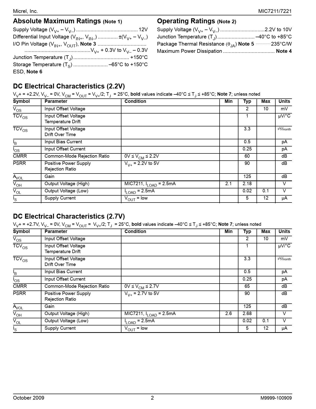 Micrel, Inc. MIC7211/7221 Absolute Maximum Ratings (Note 1) Operating Ratings (Note 2) Supply Voltage (VV+ – VV–). 12V
