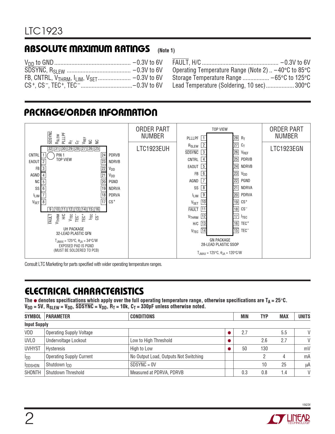 LTC1923 WWWUABSOLUTE AXI U RATI GS (Note 1) VDD to GND... – 0.3V to 6V FAULT, H/C ... – 0.3V to 6V SDSYNC, RSLEW ... – 0.3V to 6V Operating Temperature Range (Note 2) .. – 40°C to 85°C FB, CNTRL, VTHRM, ILIM, VSET... – 0.3V to 6V Storage Temperature Range ... – 65°C to 125°C CS +, CS –, TEC+, TEC – ...– 0.3V to 6V Lead Temperature (Soldering, 10 sec).. 300°C UWUPACKAGE/ORDER I FOR ATIO TOP VIEW ORDER PART ORDER PART NUMBER PLLLPF 1 28 R NUMBER T SLEW T T REF SDSYNC R PLLLPF R C V NC NC R 2 27 SLEW CT 32 31 30 29 28 27 26 25 LTC1923EUH LTC1923EGN SDSYNC 3 26 VREF CNTRL 1 PIN 1 24 PDRVB TOP VIEW CNTRL 4 25 PDRVB EAOUT 2 23 NDRVB EAOUT 5 24 NDRVB FB 3 22 VDD FB 6 23 VDD AGND 4 21 VDD AGND 7 22 PGND NC 5 20 PGND SS 6 19 NDRVA SS 8 21 NDRVA I 7 18 PDRVA I 9 20 LIM LIM PDRVA V 8 17 SET CS + V 10 19 SET CS+ 9 10 11 12 13 14 15 16 FAULT 11 18 CS– – + – V 12 17 H/C TEC THRM ITEC V I TEC TEC TEC CS FAULT THRMV H/C 13 16 TEC+ UH PACKAGE V 14 15 TEC TEC– 32-LEAD PLASTIC QFN T GN PACKAGE JMAX = 125°C, θJA = 34°C/W 28-LEAD PLASTIC SSOP EXPOSED PAD IS PGND (MUST BE SOLDERED TO PCB) TJMAX = 125°C, θJA = 120°C/W Consult LTC Marketing for parts specified with wider operating temperature ranges. ELECTRICAL CHARACTERISTICS The ● denotes specifications which apply over the full operating temperature range, otherwise specifications are TA = 25 ° C.VDD = 5V, RSLEW = VDD, SDSYNC = VDD, RT = 10k, CT = 330pF unless otherwise noted.SYMBOLPARAMETERCONDITIONSMINTYPMAXUNITSInput Supply VDD Operating Supply Voltage ● 2.7 5.5 V UVLO Undervoltage Lockout Low to High Threshold ● 2.6 2.7 V UVHYST Hysteresis High to Low ● 50 130 mV IDD Operating Supply Current No Output Load, Outputs Not Switching 2 4 mA IDDSHDN Shutdown IDD SDSYNC = 0V 10 25 µA SHDNTH Shutdown Threshold Measured at PDRVA, PDRVB 0.3 0.8 1.4 V 1923f 2