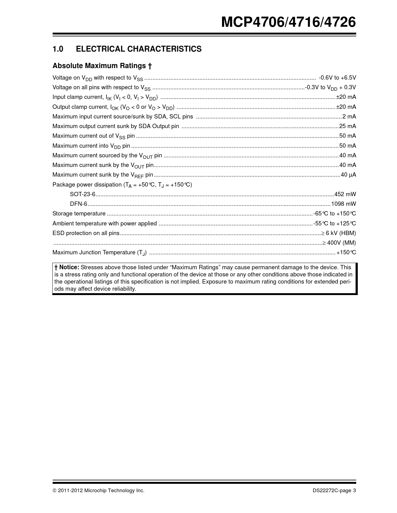 MCP4706/4716/4726. 1.0. ELECTRICAL CHARACTERISTICS. Absolute Maximum Ratings †. † Notice: