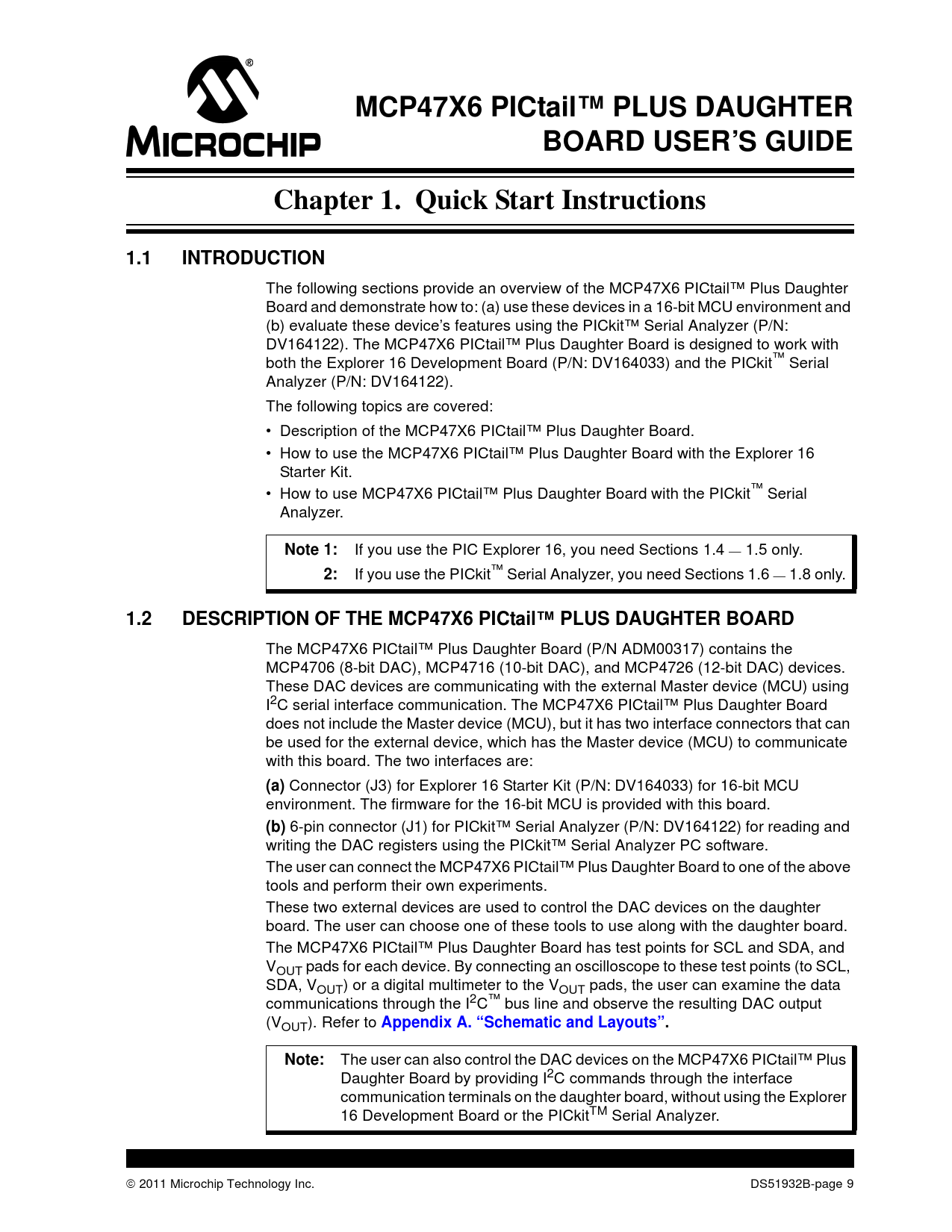 MCP47X6 PICtail™ PLUS DAUGHTER. BOARD USER’S GUIDE. Chapter 1. Quick Start Instructions. 1.1. INTRODUCTION. Note 1:. 1.2