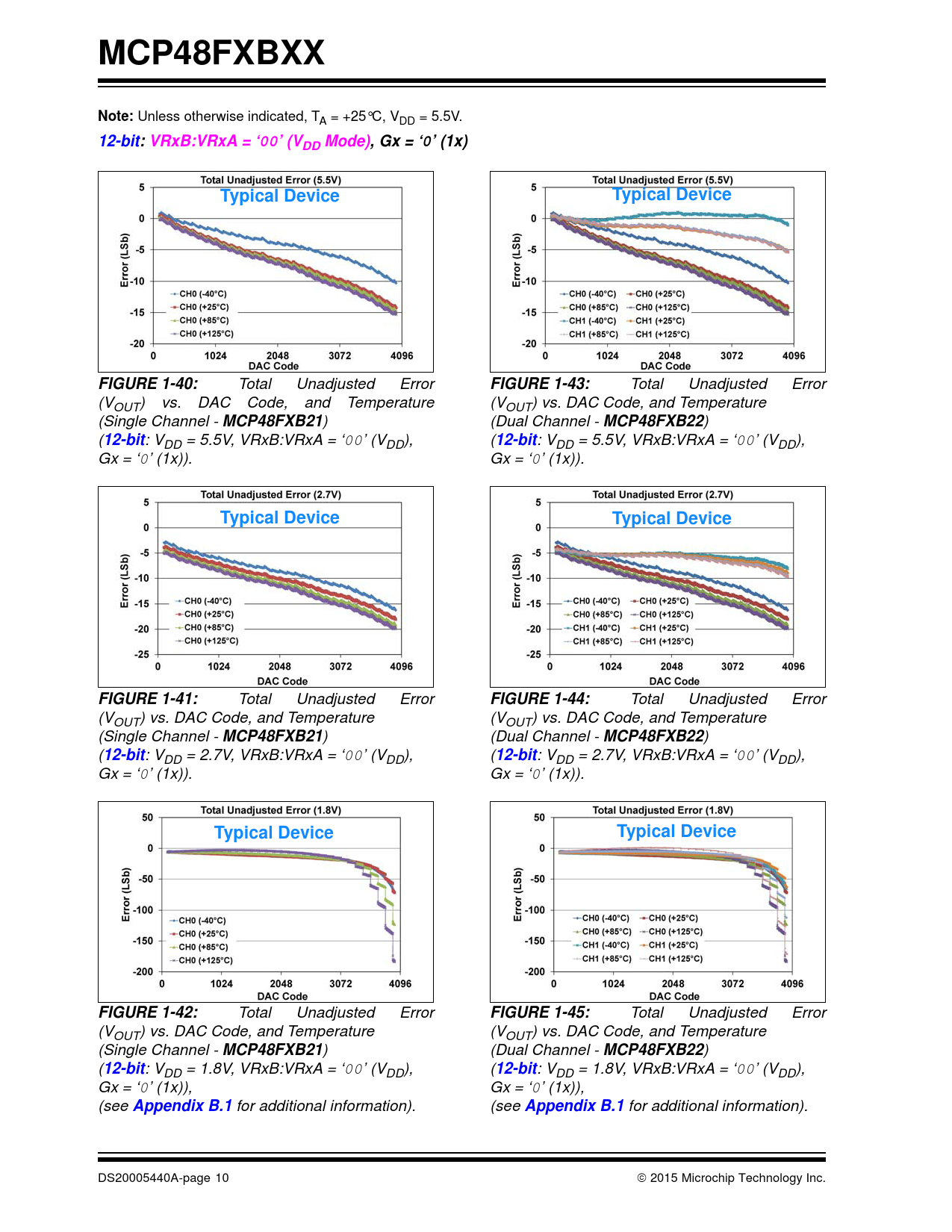 for additional information). DS20005440A-page 10 2015 Microchip Technology Inc. Document Outline 1.0 Typical Performance Curves 12-bit FIGURE 1-40: Total Unadjusted Error (VOUT) vs. DAC Code, and Temperature (Single Channel - MCP48FXB21) (12-bit: VDD = 5.5V, VRxB:VRxA = ‘00’ (VDD), Gx = ‘0’ (1x)). FIGURE 1-41: Total Unadjusted Error (VOUT) vs. DAC Code, and Temperature (Single Channel - MCP48FXB21) (12-bit: VDD = 2.7V, VRxB:VRxA = ‘00’ (VDD), Gx = ‘0’ (1x)). FIGURE 1-42: Total Unadjusted Error (VOUT) vs. DAC Code, and Temperature (Single Channel - MCP48FXB21) (12-bit: VDD = 1.8V, VRxB:VRxA = ‘00’ (VDD), Gx = ‘0’ (1x)), (see Appendix B.1 for additional information). FIGURE 1-43: Total Unadjusted Error (VOUT) vs. DAC Code, and Temperature (Dual Channel - MCP48FXB22) (12-bit: VDD = 5.5V, VRxB:VRxA = ‘00’ (VDD), Gx = ‘0’ (1x)). FIGURE 1-44: Total Unadjusted Error (VOUT) vs. DAC Code, and Temperature (Dual Channel - MCP48FXB22) (12-bit: VDD = 2.7V, VRxB:VRxA = ‘00’ (VDD), Gx = ‘0’ (1x)). FIGURE 1-45: Total Unadjusted Error (VOUT) vs. DAC Code, and Temperature (Dual Channel - MCP48FXB22) (12-bit: VDD = 1.8V, VRxB:VRxA = ‘00’ (VDD), Gx = ‘0’ (1x)), (see Appendix B.1 for additional information). FIGURE 1-46: INL Error vs. DAC Code, and Temperature (Code 100 - 4000) (Single Channel - MCP48FXB21) (12-bit: VDD = 5.5V, VRxB:VRxA = ‘00’ (VDD), Gx = ‘0’ (1x)). FIGURE 1-47: INL Error vs. DAC Code, and Temperature (Code 100 - 4000) (Single Channel - MCP48FXB21) (12-bit: VDD = 2.7V, VRxB:VRxA = ‘00’ (VDD), Gx = ‘0’ (1x)). FIGURE 1-48: INL Error vs. DAC Code, and Temperature (Code 100 - 4000) (Single Channel - MCP48FXB21) (12-bit: VDD = 1.8V, VRxB:VRxA = ‘00’ (VDD), Gx = ‘0’ (1x)), (see Appendix B.1 for additional information). FIGURE 1-49: INL Error vs. DAC Code, and Temperature (Code 100 - 4000) (Dual Channel - MCP48FXB22) (12-bit: VDD = 5.5V, VRxB:VRxA = ‘00’ (VDD), Gx = ‘0’ (1x)). FIGURE 1-50: INL Error vs. DAC Code, and Temperature (Code 100 - 4000) (Dual Channel - MCP48FXB22) (12-bit: VDD = 2.7V, VRxB:VRxA = ‘00’ (VDD), Gx = ‘0’ (1x)). FIGURE 1-51: INL Error vs. DAC Code, and Temperature (Code 100 - 4000) (Dual Channel - MCP48FXB22) (12-bit: VDD = 1.8V, VRxB:VRxA = ‘00’ (VDD), Gx = ‘0’ (1x)), (see Appendix B.1 for additional information). FIGURE 1-52: DNL Error vs. DAC Code, and Temperature (Code 100 - 4000) (Single Channel - MCP48FXB21) (12-bit: VDD = 5.5V, VRxB:VRxA = ‘00’ (VDD), Gx = ‘0’ (1x)). FIGURE 1-53: DNL Error vs. DAC Code, and Temperature (Code 100 - 4000) (Single Channel - MCP48FXB21) (12-bit: VDD = 2.7V, VRxB:VRxA = ‘00’ (VDD), Gx = ‘0’ (1x)). FIGURE 1-54: DNL Error vs. DAC Code, and Temperature (Code 100 - 4000) (Single Channel - MCP48FXB21) (12-bit: VDD = 1.8V, VRxB:VRxA = ‘00’ (VDD), Gx = ‘0’ (1x)), (see Appendix B.1 for additional information). FIGURE 1-55: DNL Error vs. DAC Code, and Temperature (Code 100 - 4000) (Dual Channel - MCP48FXB22) (12-bit: VDD = 5.5V, VRxB:VRxA = ‘00’ (VDD), Gx = ‘0’ (1x)). FIGURE 1-56: DNL Error vs. DAC Code, and Temperature (Code 100 - 4000) (Dual Channel - MCP48FXB22) (12-bit: VDD = 2.7V, VRxB:VRxA = ‘00’ (VDD), Gx = ‘0’ (1x)). FIGURE 1-57: DNL Error vs. DAC Code, and Temperature (Code 100 - 4000) (Dual Channel - MCP48FXB22) (12-bit: VDD = 1.8V, VRxB:VRxA = ‘00’ (VDD), Gx = ‘0’ (1x)), (see Appendix B.1 for additional information). FIGURE 1-58: Total Unadjusted Error (VOUT) vs. DAC Code, and Temperature (Single Channel - MCP48FXB21) (12-bit: VDD = 5.5V, VRxB:VRxA = ‘01’ (Bandgap), Gx = ‘1’ (2x)). FIGURE 1-59: Total Unadjusted Error (VOUT) vs. DAC Code, and Temperature (Single Channel - MCP48FXB21) (12-bit: VDD = 5.5V, VRxB:VRxA = ‘01’ (Bandgap), Gx = ‘0’ (1x)). FIGURE 1-60: Total Unadjusted Error (VOUT) vs. DAC Code, and Temperature (Single Channel - MCP48FXB21) (12-bit: VDD = 2.7V, VRxB:VRxA = ‘01’ (Bandgap), Gx = ‘0’ (1x)). FIGURE 1-61: Total Unadjusted Error (VOUT) vs. DAC Code, and Temperature (Dual Channel - MCP48FXB22) (12-bit: VDD = 5.5V, VRxB:VRxA = ‘01’ (Bandgap), Gx = ‘1’ (2x)). FIGURE 1-62: Total Unadjusted Error (VOUT) vs. DAC Code, and Temperature (Dual Channel - MCP48FXB22) (12-bit: VDD = 5.5V, VRxB:VRxA = ‘01’ (Bandgap), Gx = ‘0’ (1x)). FIGURE 1-63: Total Unadjusted Error (VOUT) vs. DAC Code, and Temperature (Dual Channel - MCP48FXB22) (12-bit: VDD = 2.7V, VRxB:VRxA = ‘01’ (Bandgap), Gx = ‘0’ (1x)). FIGURE 1-64: INL Error vs. DAC Code, and Temperature (Code 100 - 4000) (Single Channel - MCP48FXB21) (12-bit: VDD = 5.5V, VRxB:VRxA = ‘01’ (Bandgap), Gx = ‘1’ (2x)). FIGURE 1-65: INL Error vs. DAC Code, and Temperature (Code 100 - 4000) (Single Channel - MCP48FXB21) (12-bit: VDD = 5.5V, VRxB:VRxA = ‘01’ (Bandgap), Gx = ‘0’ (1x)). FIGURE 1-66: INL Error vs. DAC Code, and Temperature (Code 100 - 4000) (Single Channel - MCP48FXB21) (12-bit: VDD = 2.7V, VRxB:VRxA = ‘01’ (Bandgap), Gx = ‘0’ (1x)). FIGURE 1-67: INL Error vs. DAC Code, and Temperature (Code 100 - 4000) (Dual Channel - MCP48FXB22) (12-bit: VDD = 5.5V, VRxB:VRxA = ‘01’ (Bandgap), Gx = ‘1’ (2x)). FIGURE 1-68: INL Error vs. DAC Code, and Temperature (Code 100 - 4000) (Dual Channel - MCP48FXB22) (12-bit: VDD = 5.5V, VRxB:VRxA = ‘01’ (Bandgap), Gx = ‘0’ (1x)). FIGURE 1-69: INL Error vs. DAC Code, and Temperature (Code 100 - 4000) (Dual Channel - MCP48FXB22) (12-bit: VDD = 2.7V, VRxB:VRxA = ‘01’ (Bandgap), Gx = ‘0’ (1x)). FIGURE 1-70: DNL Error vs. DAC Code, and Temperature (Code 100 - 4000) (Single Channel - MCP48FXB21) (12-bit: VDD = 5.5V, VRxB:VRxA = ‘01’ (Bandgap), Gx = ‘1’ (2x)). FIGURE 1-71: DNL Error vs. DAC Code, and Temperature (Code 100 - 4000) (Single Channel - MCP48FXB21) (12-bit: VDD = 5.5V, VRxB:VRxA = ‘01’ (Bandgap), Gx = ‘0’ (1x)). FIGURE 1-72: DNL Error vs. DAC Code, and Temperature (Code 100 - 4000) (Single Channel - MCP4