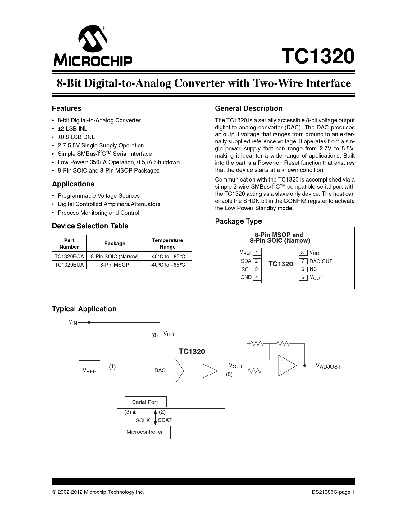 TC13208-Bit Digital-to-Analog Converter with Two-Wire InterfaceFeaturesGeneral Description • 8-bit Digital-to-Analog Converter The TC1320 is a serially accessible 8-bit voltage output • ±2 LSB INL digital-to-analog converter (DAC). The DAC produces • ±0.8 LSB DNL an output voltage that ranges from ground to an exter- nally supplied reference voltage. It operates from a sin- • 2.7-5.5V Single Supply Operation gle power supply that can range from 2.7V to 5.5V, • Simple SMBus/I2CTM Serial Interface making it ideal for a wide range of applications. Built • Low Power : 350A Operation, 0.5A Shutdown into the part is a Power-on Reset function that ensures • 8-Pin SOIC and 8-Pin MSOP Packages that the device starts at a known condition. Communication with the TC1320 is accomplished via a Applications simple 2-wire SMBus/I2C™ compatible serial port with • Programmable Voltage Sources the TC1320 acting as a slave only device. The host can enable the SHDN bit in the CONFIG register to activate • Digital Controlled Amplifiers/Attenuators the Low Power Standby mode. • Process Monitoring and Control Package TypeDevice Selection Table8-Pin MSOP andPartTemperature8-Pin SOIC (Narrow)PackageNumberRange VREF 1 8 VDD TC1320EOA 8-Pin SOIC (Narrow) -40°C to +85°C SDA 2 7 DAC-OUT TC1320EUA 8-Pin MSOP -40°C to +85°C TC1320 SCL 3 6 NC GND 4 5 VOUT Typical Application VIN V (8) DD TC1320 – (1) VOUT VADJUST VREF DAC + (5) Serial Port (3) (2) (2) SCLK SDAT Microcontroller 2002-2012 Microchip Technology Inc. DS21386C-page 1