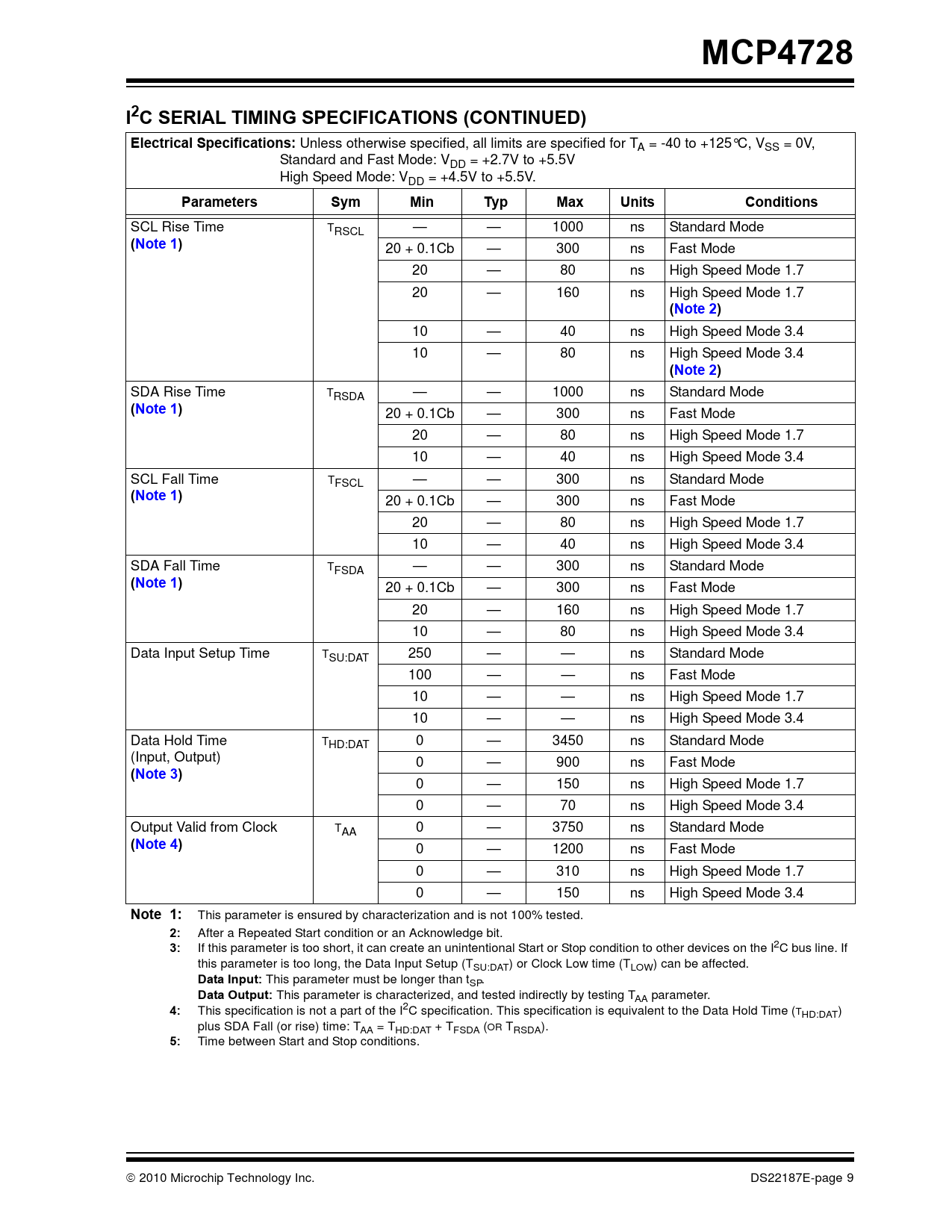 20 + 0.1Cb — 300 ns Fast Mode 20 — 160 ns High Speed Mode 1.7 10 — 80 ns High Speed Mode 3.4 Data Input Setup Time TSU:DAT 250 — — ns Standard Mode 100 — — ns Fast Mode 10 — — ns High Speed Mode 1.7 10 — — ns High Speed Mode 3.4 Data Hold Time THD:DAT 0 — 3450 ns Standard Mode (Input, Output) 0 — 900 ns Fast Mode