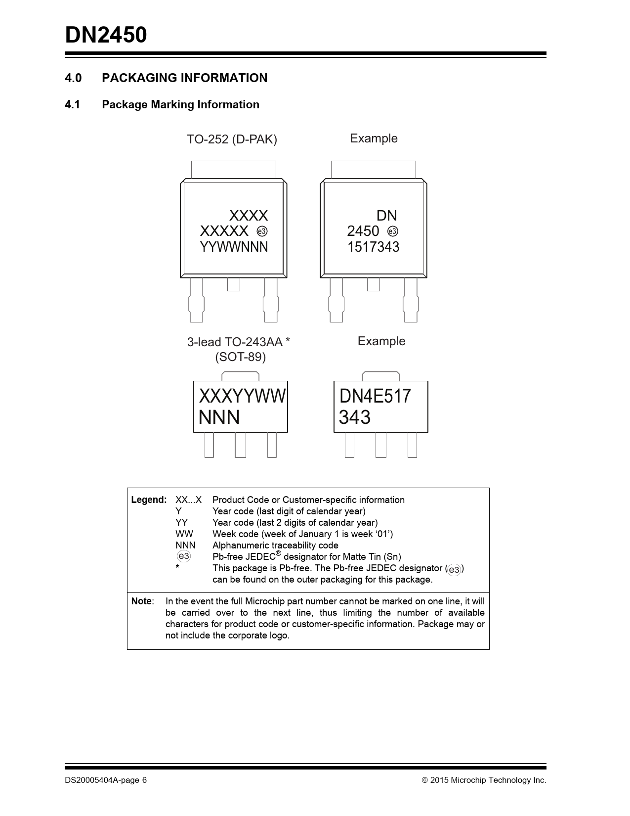 DN2450. 4.0. PACKAGING INFORMATION. 4.1. Package Marking Information. Legend:. Note