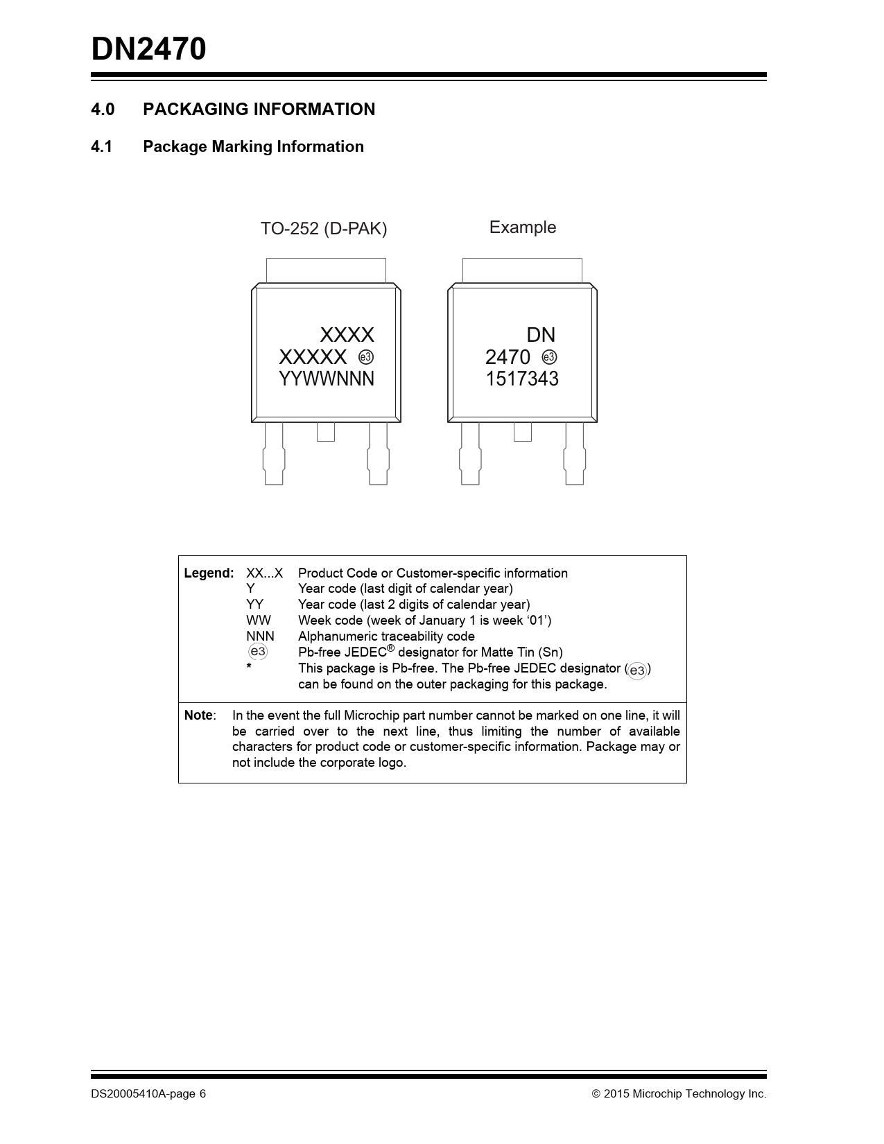 DN24704.0PACKAGING INFORMATION4.1Package Marking Information TO-252 (D-PAK) Example XXXX DN XXXXX e3 2470 e3 YYWWNNN 1517343 Legend: XX...X Product Code or Customer-specific information Y Year code (last digit of calendar year) YY Year code (last 2 digits of calendar year) WW Week code (week of January 1 is week ‘01’) NNN Alphanumeric traceability code e3 Pb-free JEDEC® designator for Matte Tin (Sn) * This package is Pb-free. The Pb-free JEDEC designator ( ) e3 can be found on the outer packaging for this package. Note : In the event the full Microchip part number cannot be marked on one line, it will be carried over to the next line, thus limiting the number of available characters for product code or customer-specific information. Package may or not include the corporate logo. DS20005410A-page 6 2015 Microchip Technology Inc. Document Outline 1.0 Electrical Characteristics TABLE 1-1: Thermal characteristics 2.0 Pin Description TABLE 2-1: Pin Description 3.0 Application Information FIGURE 3-1: Switching Waveforms and Test Circuit 4.0 Packaging Information 4.1 Package Marking Information AMERICAS Corporate Office Atlanta Austin, TX Boston Chicago Cleveland Dallas Detroit Houston, TX Indianapolis Los Angeles New York, NY San Jose, CA Canada - Toronto ASIA/PACIFIC Asia Pacific Office Hong Kong Australia - Sydney China - Beijing China - Chengdu China - Chongqing China - Dongguan China - Hangzhou China - Hong Kong SAR China - Nanjing China - Qingdao China - Shanghai China - Shenyang China - Shenzhen China - Wuhan China - Xian ASIA/PACIFIC China - Xiamen China - Zhuhai India - Bangalore India - New Delhi India - Pune Japan - Osaka Japan - Tokyo Korea - Daegu Korea - Seoul Malaysia - Kuala Lumpur Malaysia - Penang Philippines - Manila Singapore Taiwan - Hsin Chu Taiwan - Kaohsiung Taiwan - Taipei Thailand - Bangkok EUROPE Austria - Wels Denmark - Copenhagen France - Paris Germany - Dusseldorf Germany - Karlsruhe Germany - Munich Italy - Milan Italy - Venice Netherlands - Drunen Poland - Warsaw Spain - Madrid Sweden - Stockholm UK - Wokingham