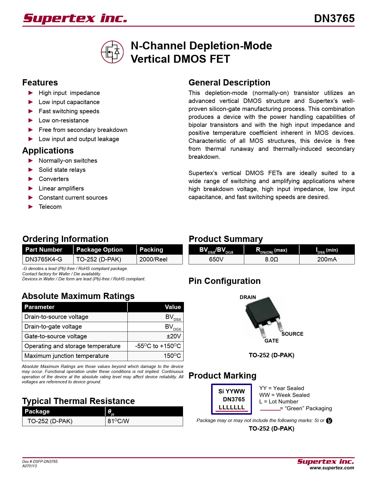 DN3765K4-G TO-252 (D-PAK) 2000/Reel 650V 8.0Ω 200mA -G denotes a lead (Pb)-free / RoHS compliant package. Contact factory for Wafer / Die availablity. Devices in Wafer / Die form are lead (Pb)-free / RoHS compliant.