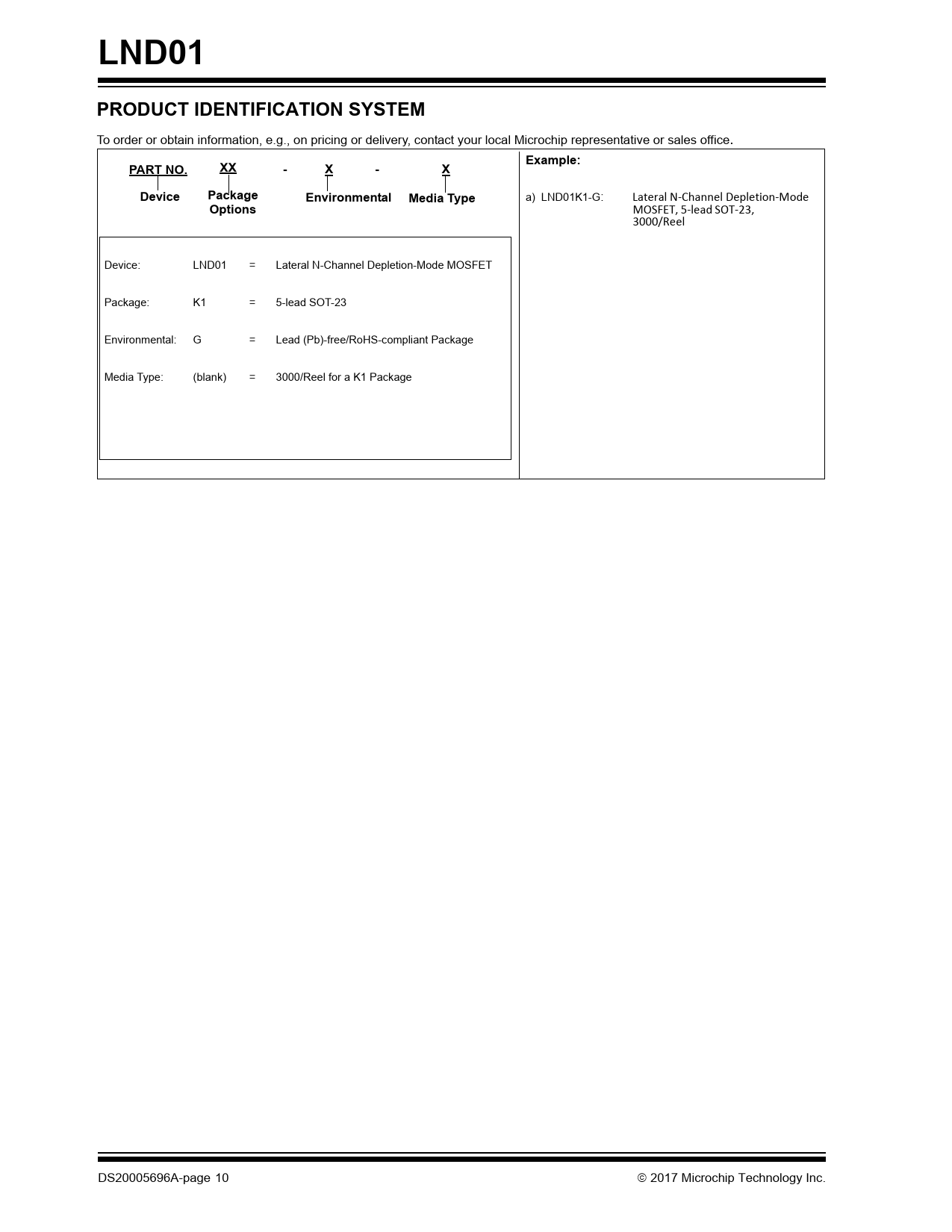 LND01PRODUCT IDENTIFICATION SYSTEM To order or obtain information, e.g., on pricing or delivery, contact your local Microchip representative or sales office. Example: PART NO. XX- X - XDevice Package Environmental Media Type a) LND01K1-G: Lateral N‐Channel Depletion‐Mode Options MOSFET, 5‐lead SOT‐23, 3000/Reel Device: LND01 = Lateral N-Channel Depletion-Mode MOSFET Package: K1 = 5-lead SOT-23 Environmental: G = Lead (Pb)-free/RoHS-compliant Package Media Type: (blank) = 3000/Reel for a K1 Package DS20005696A-page 10 2017 Microchip Technology Inc. Document Outline 1.0 Electrical Characteristics 2.0 Pin Description TABLE 2-1: Pin Function Table 3.0 Functional Description FIGURE 3-1: Switching Waveforms and Test Circuit. TABLE 3-1: Product Summary 4.0 Packaging Information 4.1 Package Marking Information