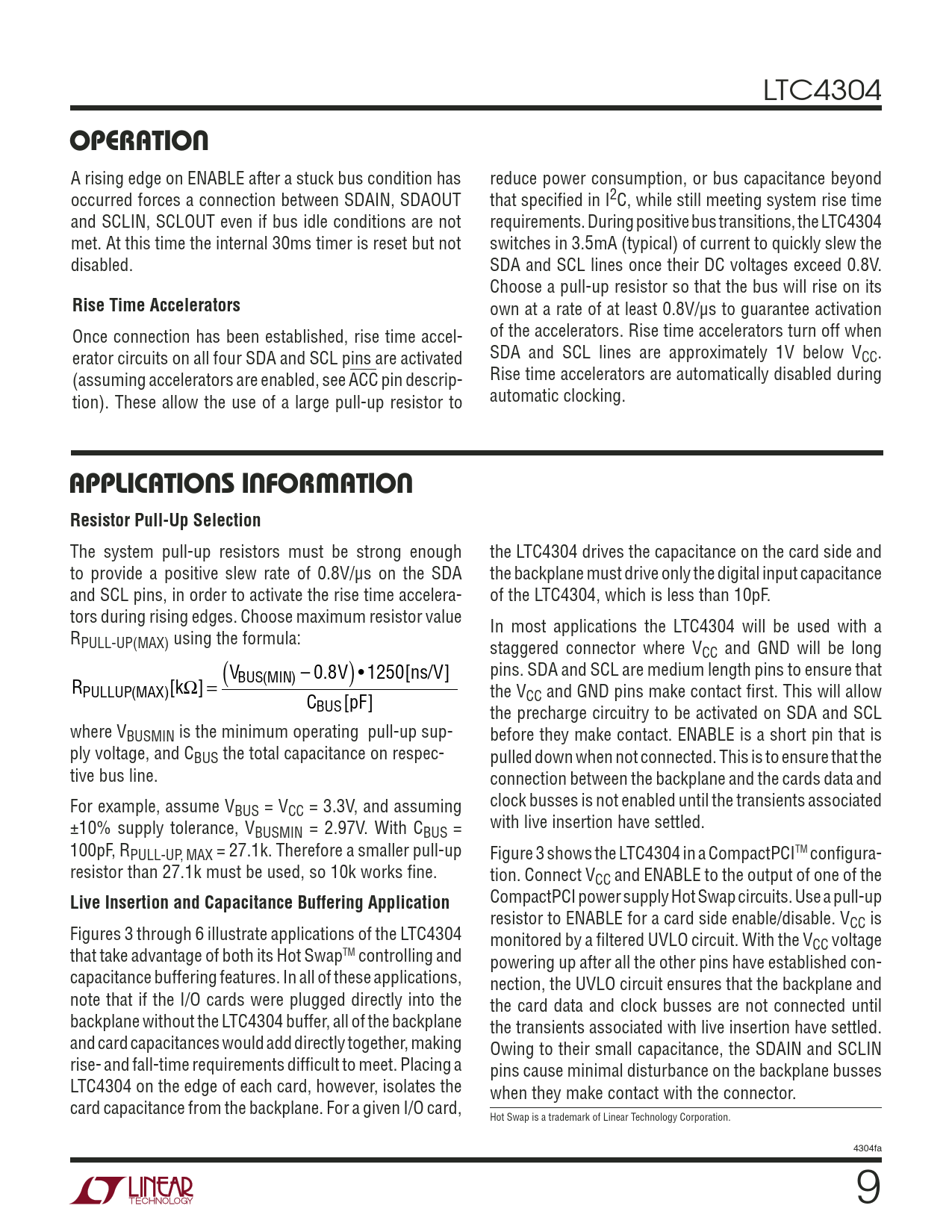 LTC4304 OPERATION A rising edge on ENABLE after a stuck bus condition has reduce power consumption, or bus capacitance beyond occurred forces a connection between SDAIN, SDAOUT that specifi ed in I2C, while still meeting system rise time and SCLIN, SCLOUT even if bus idle conditions are not requirements. During positive bus transitions, the LTC4304 met. At this time the internal 30ms timer is reset but not switches in 3.5mA (typical) of current to quickly slew the disabled. SDA and SCL lines once their DC voltages exceed 0.8V. Choose a pull-up resistor so that the bus will rise on its Rise Time Accelerators own at a rate of at least 0.8V/µs to guarantee activation Once connection has been established, rise time accel- of the accelerators. Rise time accelerators turn off when erator circuits on all four SDA and SCL pins are activated SDA and SCL lines are approximately 1V below VCC. (assuming accelerators are enabled, see ACC pin descrip- Rise time accelerators are automatically disabled during tion). These allow the use of a large pull-up resistor to automatic clocking. APPLICATIONS INFORMATIONResistor Pull-Up Selection The system pull-up resistors must be strong enough the LTC4304 drives the capacitance on the card side and to provide a positive slew rate of 0.8V/µs on the SDA the backplane must drive only the digital input capacitance and SCL pins, in order to activate the rise time accelera- of the LTC4304, which is less than 10pF. tors during rising edges. Choose maximum resistor value In most applications the LTC4304 will be used with a RPULL-UP(MAX) using the formula: staggered connector where VCC and GND will be long V – 0.8V • 1250 ns [ /V ( pins. SDA and SCL are medium length pins to ensure that BUS MIN ( ) ] ) R k PULLUP MAX ( )[ Ω] = the V C p [ F CC and GND pins make contact fi rst. This will allow BUS ] the precharge circuitry to be activated on SDA and SCL where VBUSMIN is the minimum operating pull-up sup- before they make contact. ENABLE is a short pin that is ply voltage, and CBUS the total capacitance on respec- pulled down when not connected. This is to ensure that the tive bus line. connection between the backplane and the cards data and For example, assume V clock busses is not enabled until the transients associated BUS = VCC = 3.3V, and assuming ±10% supply tolerance, V with live insertion have settled. BUSMIN = 2.97V. With CBUS = 100pF, RPULL-UP, MAX = 27.1k. Therefore a smaller pull-up Figure 3 shows the LTC4304 in a CompactPCITM confi gura- resistor than 27.1k must be used, so 10k works fi ne. tion. Connect VCC and ENABLE to the output of one of the Live Insertion and Capacitance Buffering Application CompactPCI power supply Hot Swap circuits. Use a pull-up resistor to ENABLE for a card side enable/disable. VCC is Figures 3 through 6 illustrate applications of the LTC4304 monitored by a fi ltered UVLO circuit. With the VCC voltage that take advantage of both its Hot SwapTM controlling and powering up after all the other pins have established con- capacitance buffering features. In all of these applications, nection, the UVLO circuit ensures that the backplane and note that if the I/O cards were plugged directly into the the card data and clock busses are not connected until backplane without the LTC4304 buffer, all of the backplane the transients associated with live insertion have settled. and card capacitances would add directly together, making Owing to their small capacitance, the SDAIN and SCLIN rise- and fall-time requirements diffi cult to meet. Placing a pins cause minimal disturbance on the backplane busses LTC4304 on the edge of each card, however, isolates the when they make contact with the connector. card capacitance from the backplane. For a given I/O card, Hot Swap is a trademark of Linear Technology Corporation. 4304fa 9