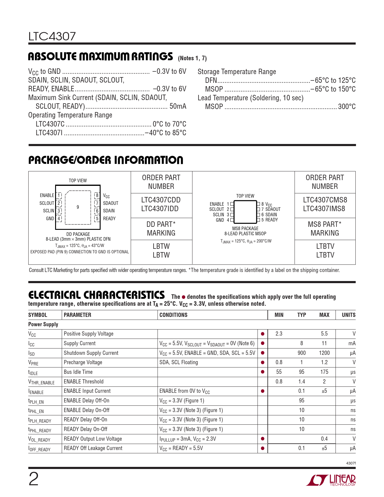 ORDER PART ORDER PART TOP VIEW NUMBER NUMBER ENABLE 1 8 VCC TOP VIEW LTC4307CDD LTC4307CMS8 SCLOUT 2 7 SDAOUT ENABLE 1 8 V 9 CC SCLIN 3 6 SDAIN LTC4307IDD SCLOUT 2 7 SDAOUT LTC4307IMS8 SCLIN 3 6 SDAIN GND 4 5 READY GND 4 5 READY DD PART* MS8 PART* MS8 PACKAGE DD PACKAGE MARKING 8-LEAD PLASTIC MSOP MARKING 8-LEAD (3mm × 3mm) PLASTIC DFN TJMAX = 125°C, θJA = 200°C/W TJMAX = 125°C, θJA = 43°C/W LBTW LTBTV EXPOSED PAD (PIN 9) CONNECTION TO GND IS OPTIONAL LBTW LTBTV Consult LTC Marketing for parts specifi ed with wider operating temperature ranges. *The temperature grade is identifi ed by a label on the shipping container.