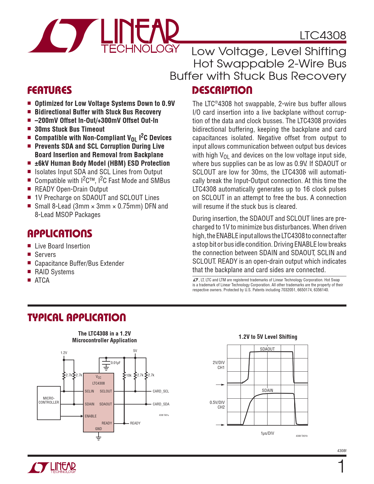 SDAOUT 5V 1.2V 0.01μF 2V/DIV CH1 2.7k 2.7k V 10k 2.7k 2.7k CC LTC4308 SCLIN SCLOUT CARD_SCL SDAIN MICRO- CONTROLLER SDAIN SDAOUT CARD_SDA 0.5V/DIV CH2 ENABLE 4308 TA01a READY READY GND 1μs/DIV 4308 TA01b 4308f 1