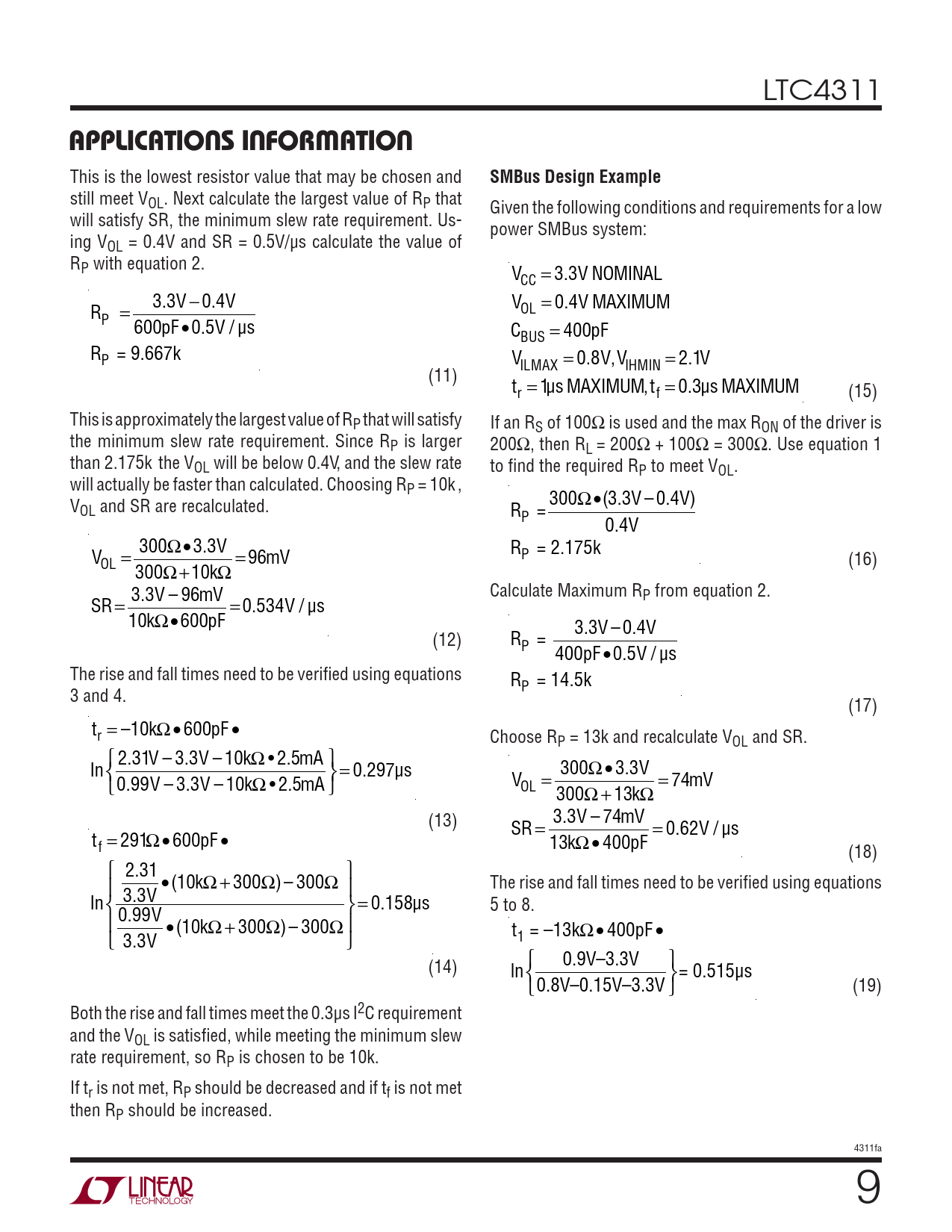 LTC4311 APPLICATIONS INFORMATION This is the lowest resistor value that may be chosen and SMBus Design Example still meet VOL. Next calculate the largest value of RP that Given the following conditions and requirements for a low will satisfy SR, the minimum slew rate requirement. Us- power SMBus system: ing VOL = 0.4V and SR = 0.5V/μs calculate the value of RP with equation 2. V = 3.3V NOMINAL CC V = 0.4V MAXIMUM R = 3.3V − 0.4V OL P 600pF •0.5V / µs C = 400pF BUS R = 9.667k P V = 0.8V,V = 2.1V ILMAX IHMIN (11) t = 1µs MAXIMUM,t = 0.3µs MAXIMUM r f (15) This is approximately the largest value of RP that will satisfy If an RS of 100Ω is used and the max RON of the driver is the minimum slew rate requirement. Since RP is larger 200Ω, then RL = 200Ω + 100Ω = 300Ω. Use equation 1 than 2.175k the VOL will be below 0.4V, and the slew rate to fi nd the required RP to meet VOL. will actually be faster than calculated. Choosing RP = 10k , V 300Ω•(3.3V – 0.4V) OL and SR are recalculated. R = P 0.4V R = 2.175k V = 300Ω•3.3V =96mV P OL (16) 300Ω+10kΩ Calculate Maximum RP from equation 2. SR = 3.3V – 96mV = 0.534V / µs 10kΩ•600pF 3.3V – 0.4V (12) R = P 400pF •0.5V / µs The rise and fall times need to be verifi ed using equations R = 14.5k P 3 and 4. (17) t = –10kΩ• 600pF • r Choose RP = 13k and recalculate VOL and SR. ⎧ 2.31V – 3.3V – 10kΩ • 2.5mA ⎫ In ⎨ ⎬ = 0.297µs V = 300Ω•3.3V = 74mV 0.99V – 3.3V – 10k ⎩ Ω • 2.5mA ⎭ OL 300Ω + 13kΩ (13) SR = 3.3V – 74mV = 0.62V / µs t = 291Ω• 600pF • f 13kΩ• 400pF (18) ⎧ 2.31 • ⎫ (10kΩ + 300Ω) – 300Ω ⎪ ⎪ The rise and fall times need to be verifi ed using equations In 3.3V ⎨ ⎬ = 0.158µs 5 to 8. 0.99V ⎪ •(10kΩ + 300Ω)– 300Ω ⎪ t = –13kΩ• 400pF • 1 ⎩ 3.3V ⎭ (14) ⎧ 0.9V–3.3V ⎫ ln ⎨ ⎬= 0.515µs 0.8V–0.15V–3.3V ⎩ ⎭ (19) Both the rise and fall times meet the 0.3μs I2C requirement and the VOL is satisfi ed, while meeting the minimum slew rate requirement, so RP is chosen to be 10k. If t r is not met, RP should be decreased and if tf is not met then RP should be increased. 4311fa 9