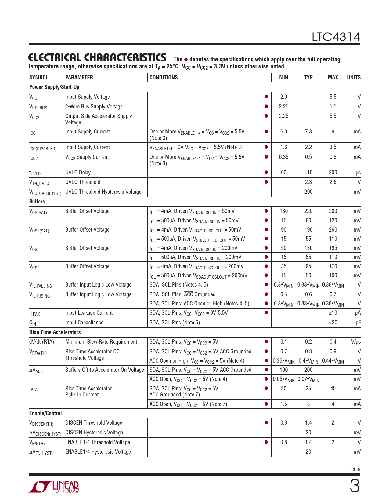 VOS(SAT) Buffer Offset Voltage IOL = 4mA, Driven VSDAIN, SCLIN = 50mV l 130 220 280 mV IOL = 500μA, Driven VSDAIN, SCLIN = 50mV l 15 60 120 mV VOS2(SAT) Buffer Offset Voltage IOL = 4mA, Driven VSDAOUT, SCLOUT = 50mV l 90 190 260 mV IOL = 500μA, Driven VSDAOUT, SCLOUT = 50mV l 15 55 110 mV VOS Buffer Offset Voltage IOL = 4mA, Driven VSDAIN, SCLIN = 200mV l 50 130 195 mV IOL = 500μA, Driven VSDAIN, SCLIN = 200mV l 15 55 110 mV VOS2 Buffer Offset Voltage IOL = 4mA, Driven VSDAOUT,SCLOUT = 200mV l 35 95 170 mV IOL = 500μA, Driven VSDAOUT,SCLOUT = 200mV l 15 50 100 mV VIL,FALLING Buffer Input Logic Low Voltage SDA, SCL Pins (Notes 4, 5) l 0.3•VMIN 0.33•VMIN 0.36•VMIN V VIL,RISING Buffer Input Logic Low Voltage SDA, SCL Pins; ACC Grounded l 0.5 0.6 0.7 V SDA, SCL Pins; ACC Open or High (Notes 4, 5) l 0.3•VMIN 0.33•VMIN 0.36•VMIN V ILEAK Input Leakage Current SDA, SCL Pins; VCC, VCC2 = 0V, 5.5V l ±10 μA CIN Input Capacitance SDA, SCL Pins (Note 6) <20 pF