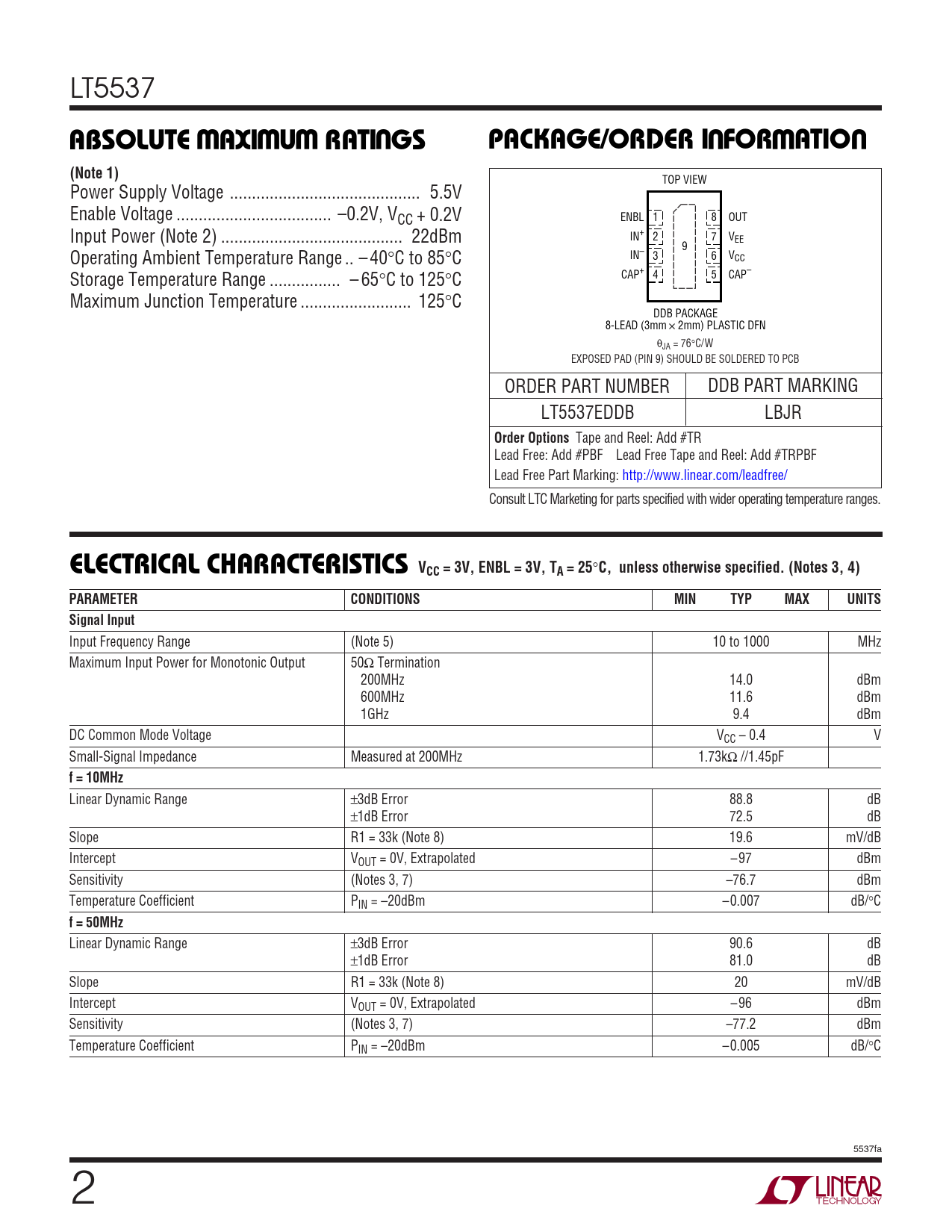 LT5537 WWWUUWUABSOLUTE AXI U RATI GSPACKAGE/ORDER I FOR ATIO(Note 1) TOP VIEW Power Supply Voltage ... 5.5V Enable Voltage ... –0.2V, VCC + 0.2V ENBL 1 8 OUT Input Power (Note 2) ... 22dBm IN+ 2 7 VEE 9 Operating Ambient Temperature Range .. – 40°C to 85°C IN– 3 6 VCC Storage Temperature Range .. – 65°C to 125°C CAP+ 4 5 CAP– Maximum Junction Temperature ... 125°C DDB PACKAGE 8-LEAD (3mm ´ 2mm) PLASTIC DFN θJA = 76°C/W EXPOSED PAD (PIN 9) SHOULD BE SOLDERED TO PCB ORDER PART NUMBER DDB PART MARKING LT5537EDDB LBJR Order Options Tape and Reel: Add #TR Lead Free: Add #PBF Lead Free Tape and Reel: Add #TRPBF Lead Free Part Marking: http://www.linear.com/leadfree/ Consult LTC Marketing for parts specified with wider operating temperature ranges. ELECTRICAL CHARACTERISTICS VCC = 3V, ENBL = 3V, TA = 25 ° C, unless otherwise specified. (Notes 3, 4)PARAMETERCONDITIONSMINTYPMAXUNITSSignal Input Input Frequency Range (Note 5) 10 to 1000 MHz Maximum Input Power for Monotonic Output 50Ω Termination 200MHz 14.0 dBm 600MHz 11.6 dBm 1GHz 9.4 dBm DC Common Mode Voltage VCC – 0.4 V Small-Signal Impedance Measured at 200MHz 1.73kΩ //1.45pF f = 10MHz Linear Dynamic Range ±3dB Error 88.8 dB ±1dB Error 72.5 dB Slope R1 = 33k (Note 8) 19.6 mV/dB Intercept VOUT = 0V, Extrapolated –97 dBm Sensitivity (Notes 3, 7) –76.7 dBm Temperature Coefficient PIN = –20dBm –0.007 dB/°C f = 50MHz Linear Dynamic Range ±3dB Error 90.6 dB ±1dB Error 81.0 dB Slope R1 = 33k (Note 8) 20 mV/dB Intercept VOUT = 0V, Extrapolated –96 dBm Sensitivity (Notes 3, 7) –77.2 dBm Temperature Coefficient PIN = –20dBm –0.005 dB/°C 5537fa 2