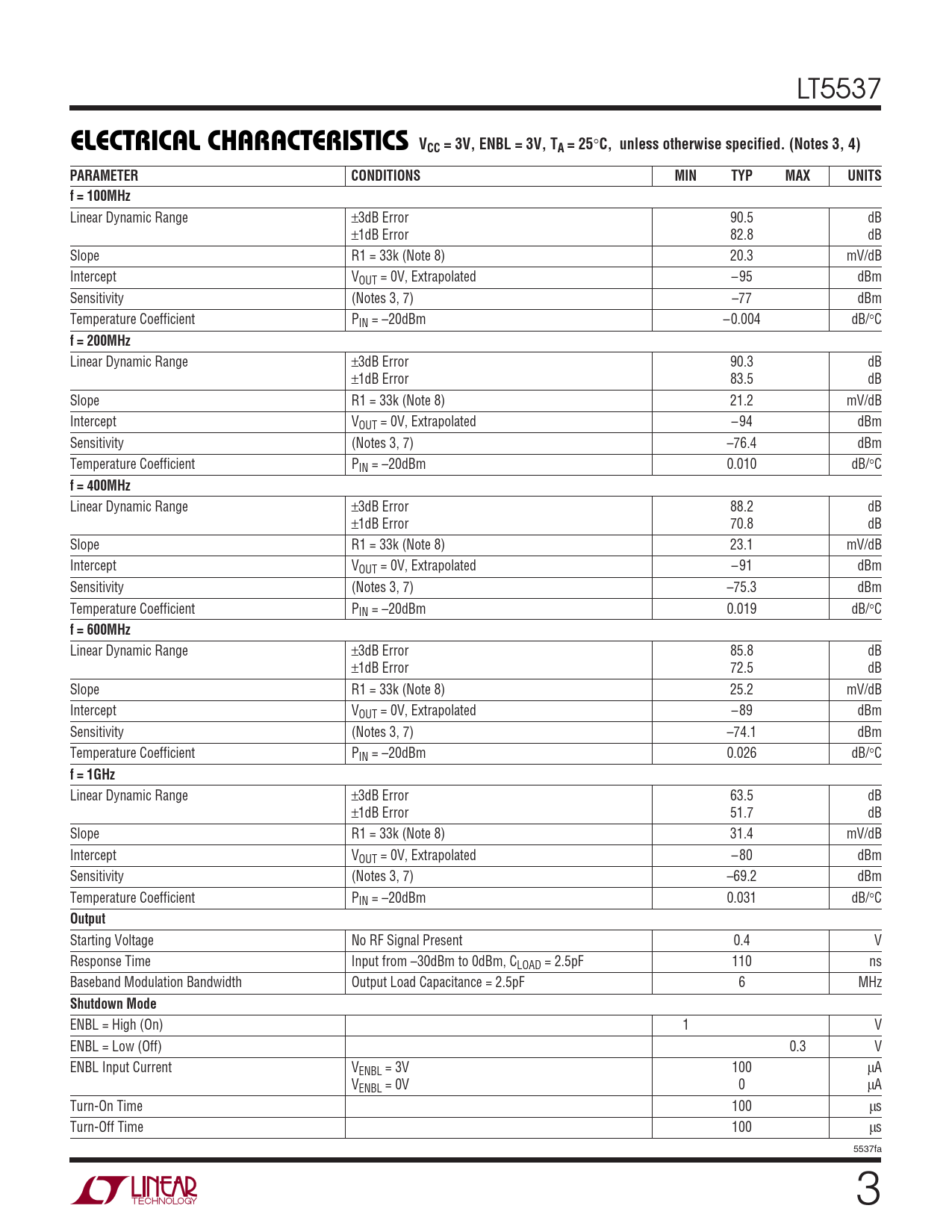 Linear Dynamic Range ±3dB Error 63.5 dB ±1dB Error 51.7 dB Slope R1 = 33k (Note 8) 31.4 mV/dB Intercept VOUT = 0V, Extrapolated –80 dBm Sensitivity (Notes 3, 7) –69.2 dBm Temperature Coefficient PIN = –20dBm 0.031 dB/°C