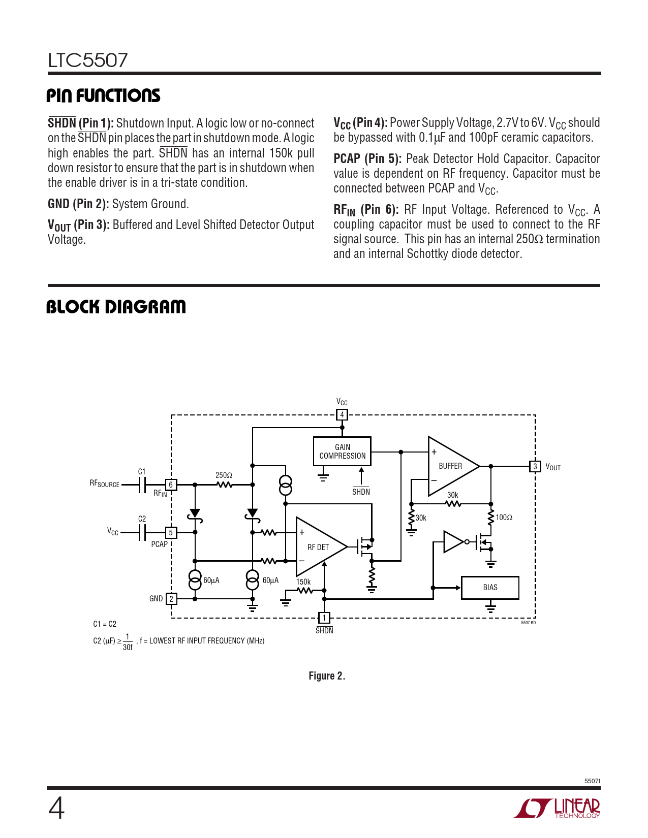 VCC 4 GAIN + COMPRESSION BUFFER 3 VOUT C1 250Ω RF – SOURCE 6 RF SHDN IN 30k C2 30k 100Ω VCC 5 + PCAP RF DET – 60µA 60µA 150k BIAS GND 2 1 5507 BD C1 = C2 SHDN 1 C2 (µF) ≥ , f = LOWEST RF INPUT FREQUENCY (MHz) 30f