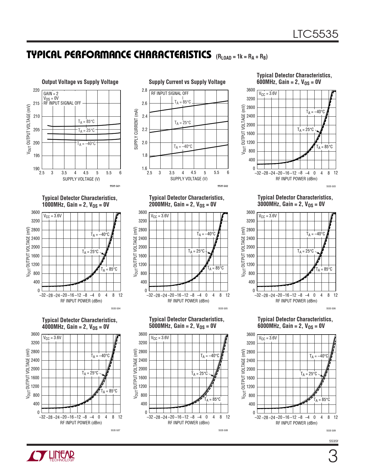220 2.8 3600 GAIN = 2 RF INPUT SIGNAL OFF VCC = 3.6V VOS = 0V 3200 215 RF INPUT SIGNAL OFF 2.6 TA = 85°C 2800 TA = –40°C 210 2.4 2400 TA = 85°C TA = 25°C 2000 205 T 2.2 T A = 25°C A = 25°C 1600 1200 OUTPUT VOLTAGE (mV) 200 T 2.0 A = –40°C OUTPUT VOLTAGE (mV) SUPPLY CURRENT (mA) TA = –40°C TA = 85°C OUTV OUT 800 V 195 1.8 400 190 1.6 0 2.5 3 3.5 4 4.5 5 5.5 6 2.5 3 3.5 4 4.5 5 5.5 6 –32 –28 –24 –20 –16 –12 –8 –4 0 4 8 12 SUPPLY VOLTAGE (V) SUPPLY VOLTAGE (V) RF INPUT POWER (dBm) 5535 G01 5535 G02 5535 G03