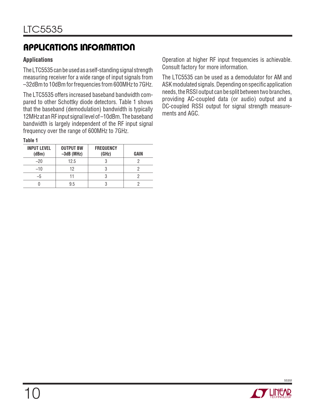 Operation at higher RF input frequencies is achievable. Consult factory for more information. The LTC5535 can be used as a self-standing signal strength measuring receiver for a wide range of input signals from The LTC5535 can be used as a demodulator for AM and –32dBm to 10dBm for frequencies from 600MHz to 7GHz. ASK modulated signals. Depending on specific application needs, the RSSI output can be split between two branches, The LTC5535 offers increased baseband bandwidth com- providing AC-coupled data (or audio) output and a pared to other Schottky diode detectors. Table 1 shows DC-coupled RSSI output for signal strength measure- that the baseband (demodulation) bandwidth is typically ments and AGC. 12MHz at an RF input signal level of –10dBm. The baseband bandwidth is largely independent of the RF input signal frequency over the range of 600MHz to 7GHz.