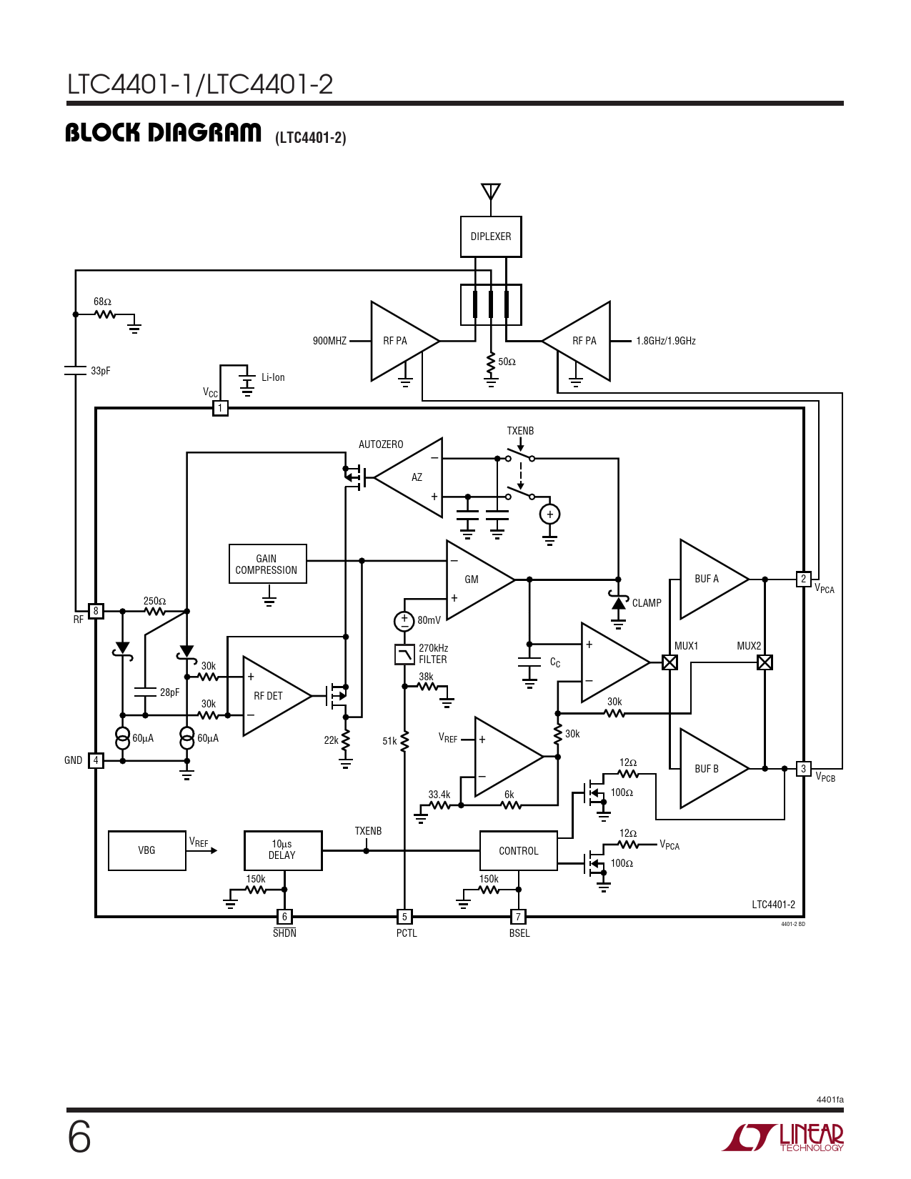 DIPLEXER 68Ω 900MHZ RF PA RF PA 1.8GHz/1.9GHz 50Ω 33pF Li-Ion VCC 1 TXENB AUTOZERO – AZ + + GAIN – COMPRESSION GM BUF A 2 VPCA 250 + Ω CLAMP 8 RF + 80mV – + 270kHz MUX1 MUX2 FILTER 30k CC + 38k – 28pF RF DET 30k 30k – 60µA 60µA 30k 22k 51k VREF + GND 4 12Ω BUF B 3 – VPCB 100 33.4k 6k Ω TXENB 12Ω VREF 10µs VPCA VBG CONTROL DELAY 100Ω 150k 150k LTC4401-2 6 5 7 4401-2 BD SHDN PCTL BSEL 4401fa 6