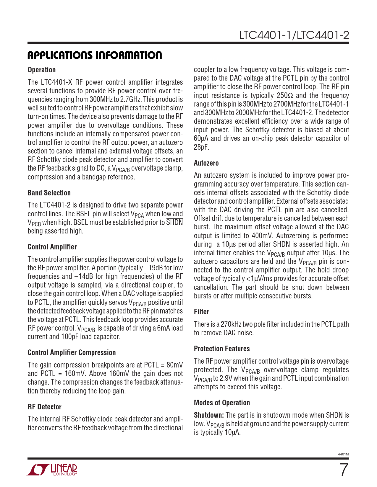 The part is in shutdown mode when SHDN is The internal RF Schottky diode peak detector and ampli- low. V fier converts the RF feedback voltage from the directional PCA/B is held at ground and the power supply current is typically 10µA. 4401fa 7