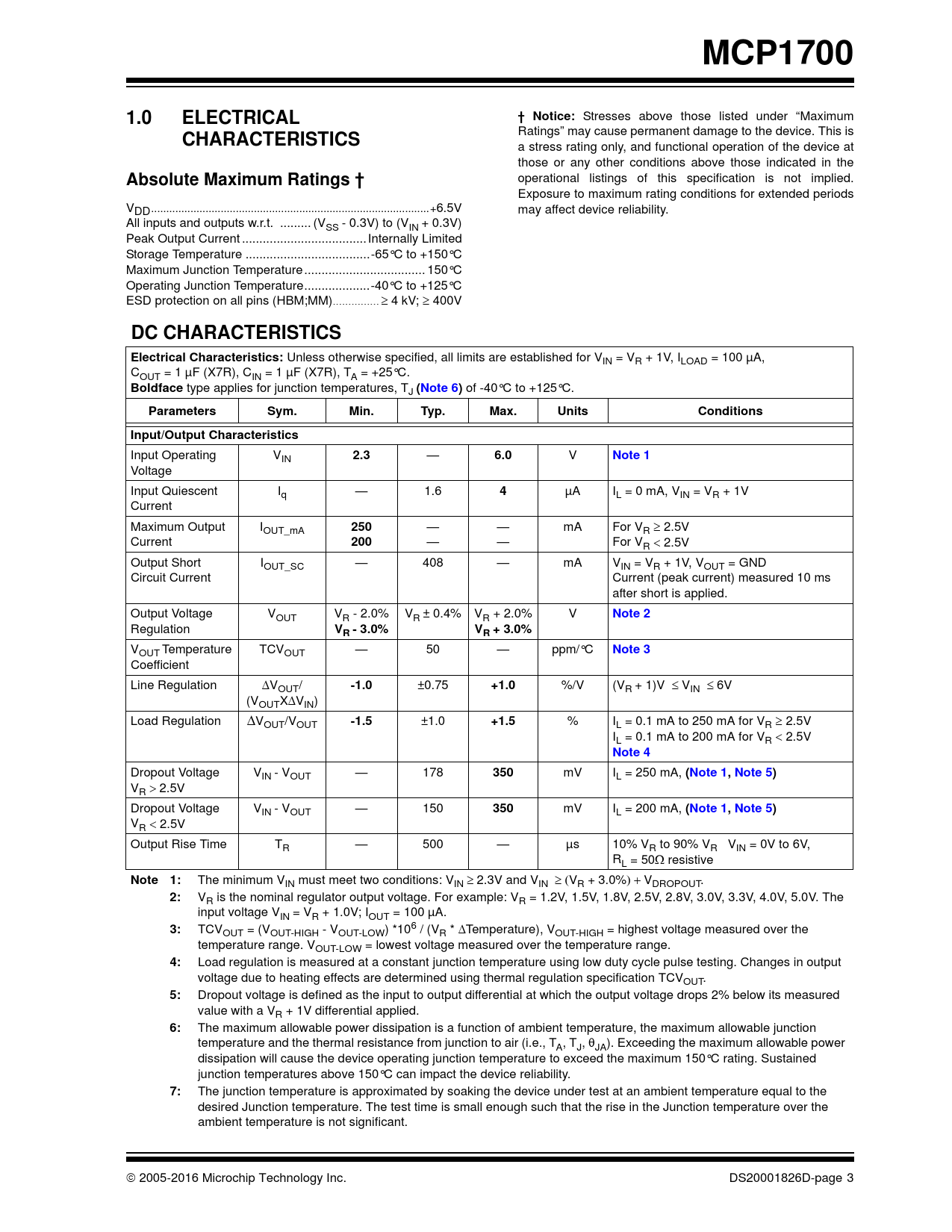 MCP1700. 1.0 ELECTRICAL. CHARACTERISTICS † Notice: Stresses above those listed under “Maximum