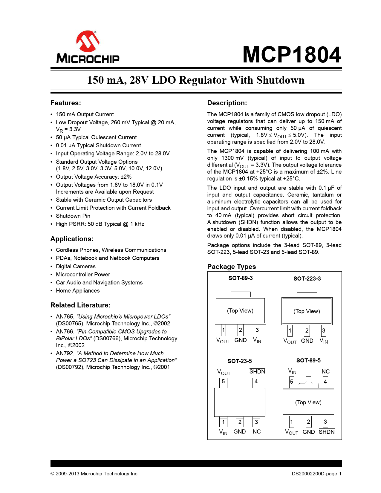 MCP1804. 150 mA, 28V LDO Regulator With Shutdown. Features:. Description:. Applications:. Package Types. SOT-89-3. SOT-223-3