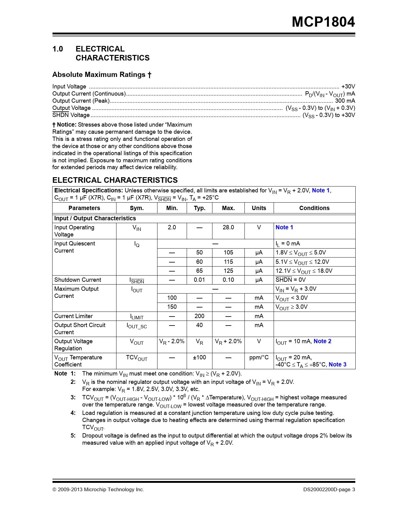link to page 3 link to page 3 link to page 3 link to page 3 MCP18041.0ELECTRICAL CHARACTERISTICSAbsolute Maximum Ratings † Input Voltage ... +30V Output Current (Continuous)... PD/(VIN - VOUT) mA Output Current (Peak).. 300 mA Output Voltage .. (VSS - 0.3V) to (VIN + 0.3V) SHDN Voltage .. (VSS - 0.3V) to +30V † Notice: Stresses above those listed under “Maximum Ratings” may cause permanent damage to the device. This is a stress rating only and functional operation of the device at those or any other conditions above those indicated in the operational listings of this specification is not implied. Exposure to maximum rating conditions for extended periods may affect device reliability. ELECTRICAL CHARACTERISTICSElectrical Specifications: Unless otherwise specified, all limits are established for VIN = VR + 2.0V, Note 1 , COUT = 1 µF (X7R), CIN = 1 µF (X7R), VSHDN = VIN, TA = +25°C ParametersSym.Min.Typ.Max.UnitsConditionsInput / Output Characteristics Input Operating VIN 2.0 — 28.0 V Note 1 Voltage Input Quiescent IQ — IL = 0 mA Current — 50 105 µA 1.8V VOUT 5.0V — 60 115 µA 5.1V VOUT 12.0V — 65 125 µA 12.1V VOUT 18.0V Shutdown Current ISHDN — 0.01 0.10 µA SHDN = 0V Maximum Output IOUT — VIN = VR + 3.0V Current 100 — — mA VOUT < 3.0V 150 — — mA VOUT 3.0V Current Limiter ILIMIT — 200 — mA Output Short Circuit IOUT_SC — 40 — mA Current Output Voltage VOUT VR - 2.0% VR VR + 2.0% V IOUT = 10 mA, Note 2 Regulation VOUT Temperature TCVOUT — ±100 — ppm/°C IOUT = 20 mA, Coefficient -40°C TA 85°C, Note 3Note 1: The minimum VIN must meet one condition: VIN (VR + 2.0V). 2: VR is the nominal regulator output voltage with an input voltage of VIN = VR + 2.0V. For example: VR = 1.8V, 2.5V, 3.0V, 3.3V, etc. 3: TCVOUT = (VOUT-HIGH - VOUT-LOW) * 106 / (VR * Temperature), VOUT-HIGH = highest voltage measured over the temperature range. VOUT-LOW = lowest voltage measured over the temperature range. 4: Load regulation is measured at a constant junction temperature using low duty cycle pulse testing. Changes in output voltage due to heating effects are determined using thermal regulation specification TCVOUT. 5: Dropout voltage is defined as the input to output differential at which the output voltage drops 2% below its measured value with an applied input voltage of VR + 2.0V. 2009-2013 Microchip Technology Inc. DS20002200D-page 3 Document Outline Features Applications Related Literature Description Package Types Functional Block Diagram Typical Application Circuit 1.0 Electrical Characteristics Absolute Maximum Ratings 2.0 Typical Performance Curves FIGURE 2-1: Output Voltage vs. Output Current. FIGURE 2-2: Output Voltage vs. Output Current. FIGURE 2-3: Output Voltage vs. Output Current. FIGURE 2-4: Output Voltage vs. Output Current. FIGURE 2-5: Output Voltage vs. Output Current. FIGURE 2-6: Output Voltage vs. Output Current. FIGURE 2-7: Output Voltage vs. Input Voltage. FIGURE 2-8: Output Voltage vs. Input Voltage. FIGURE 2-9: Output Voltage vs. Input Voltage. FIGURE 2-10: Output Voltage vs. Input Voltage. FIGURE 2-11: Output Voltage vs. Input Voltage. FIGURE 2-12: Output Voltage vs. Input Voltage. FIGURE 2-13: Dropout Voltage vs. Load Current. FIGURE 2-14: Dropout Voltage vs. Load Current. FIGURE 2-15: Dropout Voltage vs. Load Current. FIGURE 2-16: Supply Current vs. Input Voltage. FIGURE 2-17: Supply Current vs. Input Voltage. FIGURE 2-18: Supply Current vs. Input Voltage. FIGURE 2-19: Supply Current vs. Input Voltage. FIGURE 2-20: Supply Current vs. Input Voltage. FIGURE 2-21: Supply Current vs. Input Voltage. FIGURE 2-22: Output Voltage vs. Ambient Temperature. FIGURE 2-23: Output Voltage vs. Ambient Temperature. FIGURE 2-24: Output Voltage vs. Ambient Temperature. FIGURE 2-25: Dynamic Line Response. FIGURE 2-26: Dynamic Line Response. FIGURE 2-27: Dynamic Line Response. FIGURE 2-28: Dynamic Line Response. FIGURE 2-29: Dynamic Line Response. FIGURE 2-30: Dynamic Line Response. FIGURE 2-31: Dynamic Load Response. FIGURE 2-32: Dynamic Load Response. FIGURE 2-33: Dynamic Load Response. FIGURE 2-34: Start-up Response. FIGURE 2-35: Start-up Response. FIGURE 2-36: Start-up Response. FIGURE 2-37: Start-up Response. FIGURE 2-38: Start-up Response. FIGURE 2-39: Start-up Response. FIGURE 2-40: SHDN Response. FIGURE 2-41: SHDN Response. FIGURE 2-42: SHDN Response. FIGURE 2-43: SHDN Response. FIGURE 2-44: SHDN Response. FIGURE 2-45: SHDN Response. FIGURE 2-46: PSRR 3.3V @ 1 mA. FIGURE 2-47: PSRR 5.0V @ 1 mA. FIGURE 2-48: PSRR 12.0V @ 1 mA. FIGURE 2-49: PSRR 3.3V @ 30 mA. FIGURE 2-50: PSRR 5.0V @ 30 mA. FIGURE 2-51: PSRR 12V @ 30 mA. FIGURE 2-52: Ground Current vs. Output Current. FIGURE 2-53: Ground Current vs. Output Current. FIGURE 2-54: Ground Current vs. Output Current. FIGURE 2-55: Output Noise vs. Frequency. 3.0 Pin Descriptions TABLE 3-1: MCP1804 Pin Function Table 3.1 Unregulated Input Voltage (VIN) 3.2 Ground Terminal (GND) 3.3 Shutdown Input (SHDN) 3.4 Regulated Output Voltage (VOUT) 3.5 No Connect (NC) 4.0 Detailed Description 4.1 Output Regulation 4.2 Overcurrent 4.3 Shutdown 4.4 Output Capacitor 4.5 Input Capacitor 4.6 Thermal Shutdown FIGURE 4-1: Block Diagram. 5.0 Functional Description 5.1 Input 5.2 Output 6.0 Application Circuits and Issues 6.1 Typical Application FIGURE 6-1: Typical Application Circuit. 6.1.1 Application Input Conditions 6.2 Power Calculations 6.2.1 Power Dissipation 6.3 Voltage Regulator 6.3.1 Power Dissipation Example 6.3.1.1 Device Junction Temperature Rise 6.3.1.2 Junction Temperature Estimate 6.4 Voltage Reference FIGURE 6-2: Using the MCP1804 as a Voltage Reference. 6.5 Pulsed Load Applications 7.0 Packaging Information 7.1 Package Marking Information Appendix A: Revision History Product Identification System Trademarks Worldwide Sales and Service