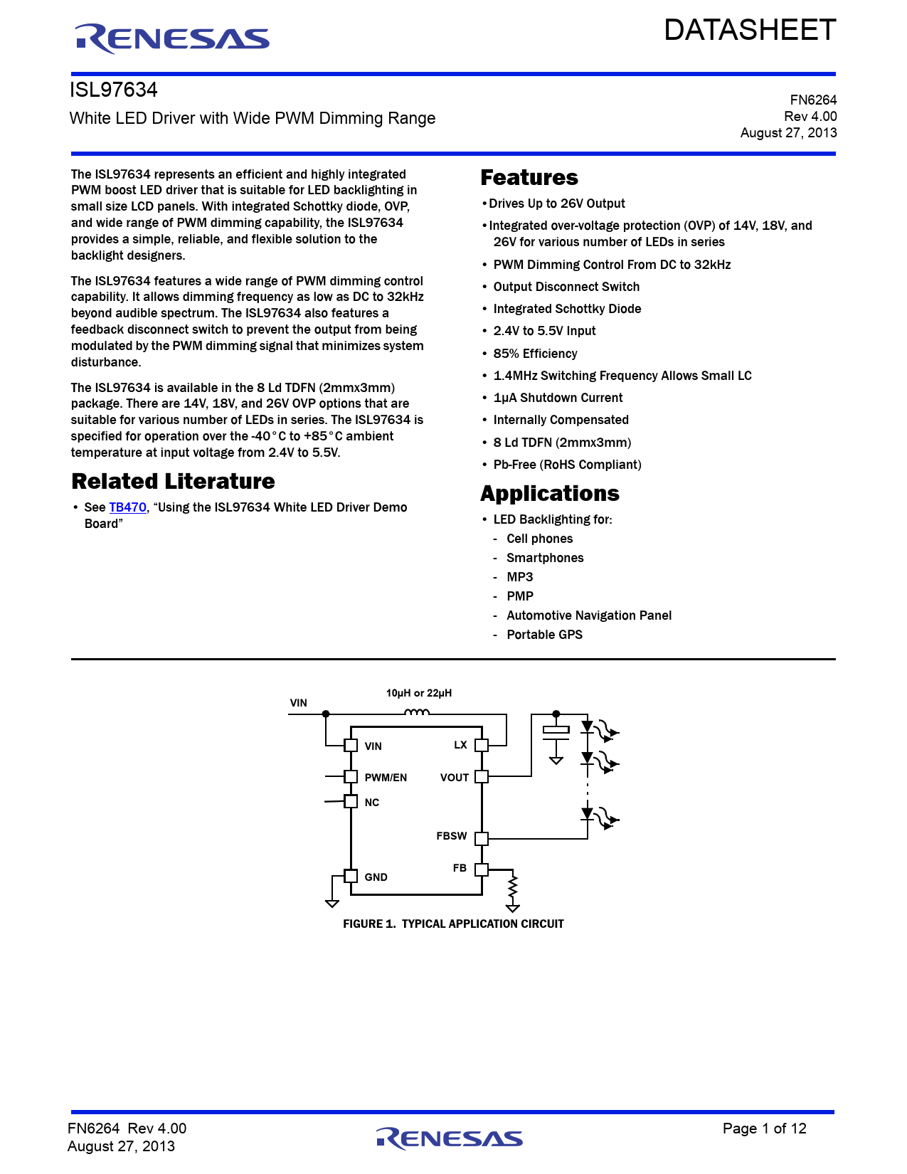 DATASHEET ISL97634 FN6264 White LED Driver with Wide PWM Dimming Range Rev 4.00 August 27, 2013 The ISL97634 represents an efficient and highly integrated Features PWM boost LED driver that is suitable for LED backlighting in small size LCD panels. With integrated Schottky diode, OVP, •Drives Up to 26V Output and wide range of PWM dimming capability, the ISL97634 •Integrated over-voltage protection (OVP) of 14V, 18V, and provides a simple, reliable, and flexible solution to the 26V for various number of LEDs in series backlight designers. • PWM Dimming Control From DC to 32kHz The ISL97634 features a wide range of PWM dimming control • Output Disconnect Switch capability. It allows dimming frequency as low as DC to 32kHz beyond audible spectrum. The ISL97634 also features a • Integrated Schottky Diode feedback disconnect switch to prevent the output from being • 2.4V to 5.5V Input modulated by the PWM dimming signal that minimizes system • 85% Efficiency disturbance. • 1.4MHz Switching Frequency Allows Small LC The ISL97634 is available in the 8 Ld TDFN (2mmx3mm) package. There are 14V, 18V, and 26V OVP options that are • 1µA Shutdown Current suitable for various number of LEDs in series. The ISL97634 is • Internally Compensated specified for operation over the -40°C to +85°C ambient • 8 Ld TDFN (2mmx3mm) temperature at input voltage from 2.4V to 5.5V. • Pb-Free (RoHS Compliant) Related Literature Applications • See TB470, “Using the ISL97634 White LED Driver Demo Board” • LED Backlighting for: - Cell phones - Smartphones - MP3 - PMP - Automotive Navigation Panel - Portable GPS 10µH or 22µHVINVINLXPWM/ENVOUTNCFBSWFBGND FIGURE 1. TYPICAL APPLICATION CIRCUIT FN6264 Rev 4.00 Page 1 of 12 August 27, 2013