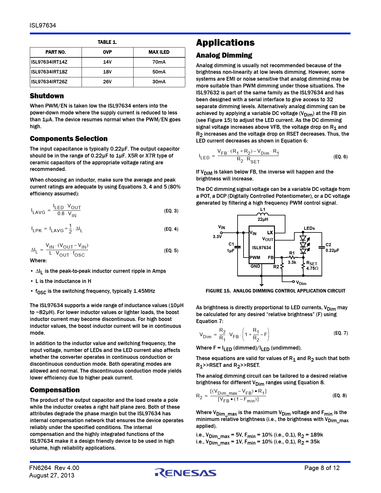 link to page 8 link to page 8 link to page 8 link to page 8 link to page 8 link to page 8 link to page 8 ISL97634 TABLE 1. Applications PART NO. OVP MAX ILED Analog Dimming ISL97634IRT14Z 14V 70mA Analog dimming is usually not recommended because of the ISL97634IRT18Z 18V 50mA brightness non-linearity at low levels dimming. However, some systems are EMI or noise sensitive that analog dimming may be ISL97634IRT26Z 26V 30mA more suitable than PWM dimming under those situations. The Shutdown ISL97632 is part of the same family as the ISL97634 and has been designed with a serial interface to give access to 32 When PWM/EN is taken low the ISL97634 enters into the separate dimming levels. Alternatively analog dimming can be power-down mode where the supply current is reduced to less achieved by applying a variable DC voltage (VDim) at the FB pin than 1µA. The device resumes normal when the PWM/EN goes (see Figure 15) to adjust the LED current. As the DC dimming high. signal voltage increases above VFB, the voltage drop on R1 and R Components Selection 2 increases and the voltage drop on RSET decreases. Thus, the LED current decreases as shown in Equation 6: The input capacitance is typically 0.22µF. The output capacitor V   +  – V  should be in the range of 0.22µF to 1µF. X5R or X7R type of I FB R1 R2 Dim R1 = ------------------------------------- LED R  (EQ. 6) ceramic capacitors of the appropriate voltage rating are 2 RSET recommended. If VDIM is taken below FB, the inverse will happen and the When choosing an inductor, make sure the average and peak brightness will increase. current ratings are adequate by using Equations 3, 4 and 5 (80% The DC dimming signal voltage can be a variable DC voltage from efficiency assumed): a POT, a DCP (Digitally Controlled Potentiometer), or a DC voltage generated by filtering a high frequency PWM control signal. I  I LED VOUT = -----------------