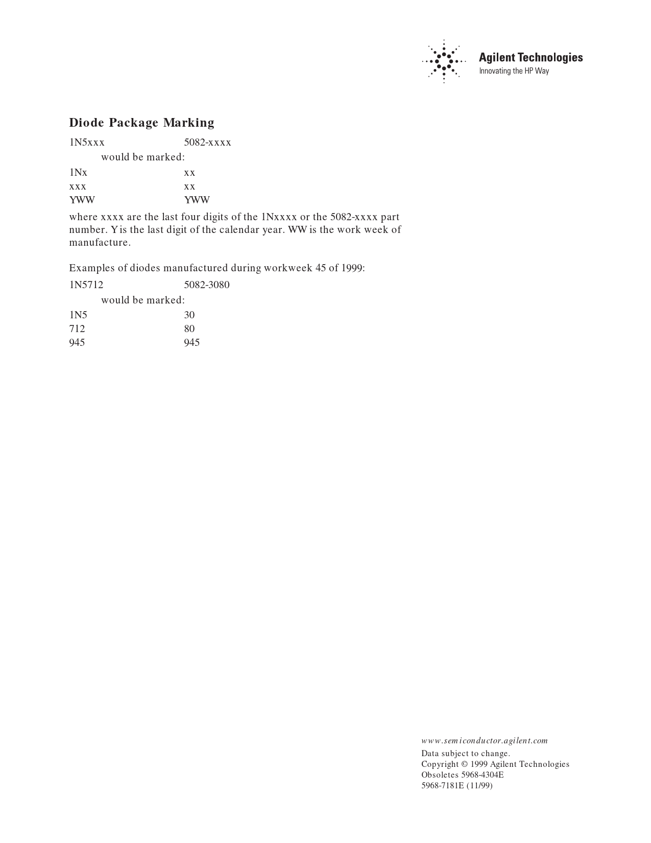 1N5xxx 5082-xxxx would be marked: 1Nx xx xxx xx YWW YWW where xxxx are the last four digits of the 1Nxxxx or the 5082-xxxx part number. Y is the last digit of the calendar year. WW is the work week of manufacture. Examples of diodes manufactured during workweek 45 of 1999: 1N5712 5082-3080 would be marked: 1N5 30 712 80 945 945 www.semiconductor.agilent.com Data subject to change. Copyright © 1999 Agilent Technologies Obsoletes 5968-4304E 5968-7181E (11/99) Document Outline 1N5711 Features Description/Applications Maximum Ratings Outline 15 Package Characteristics Electrical Specifications Matched Pairs and Quads SPICE Parameters Typical Parameters Diode Package Marking