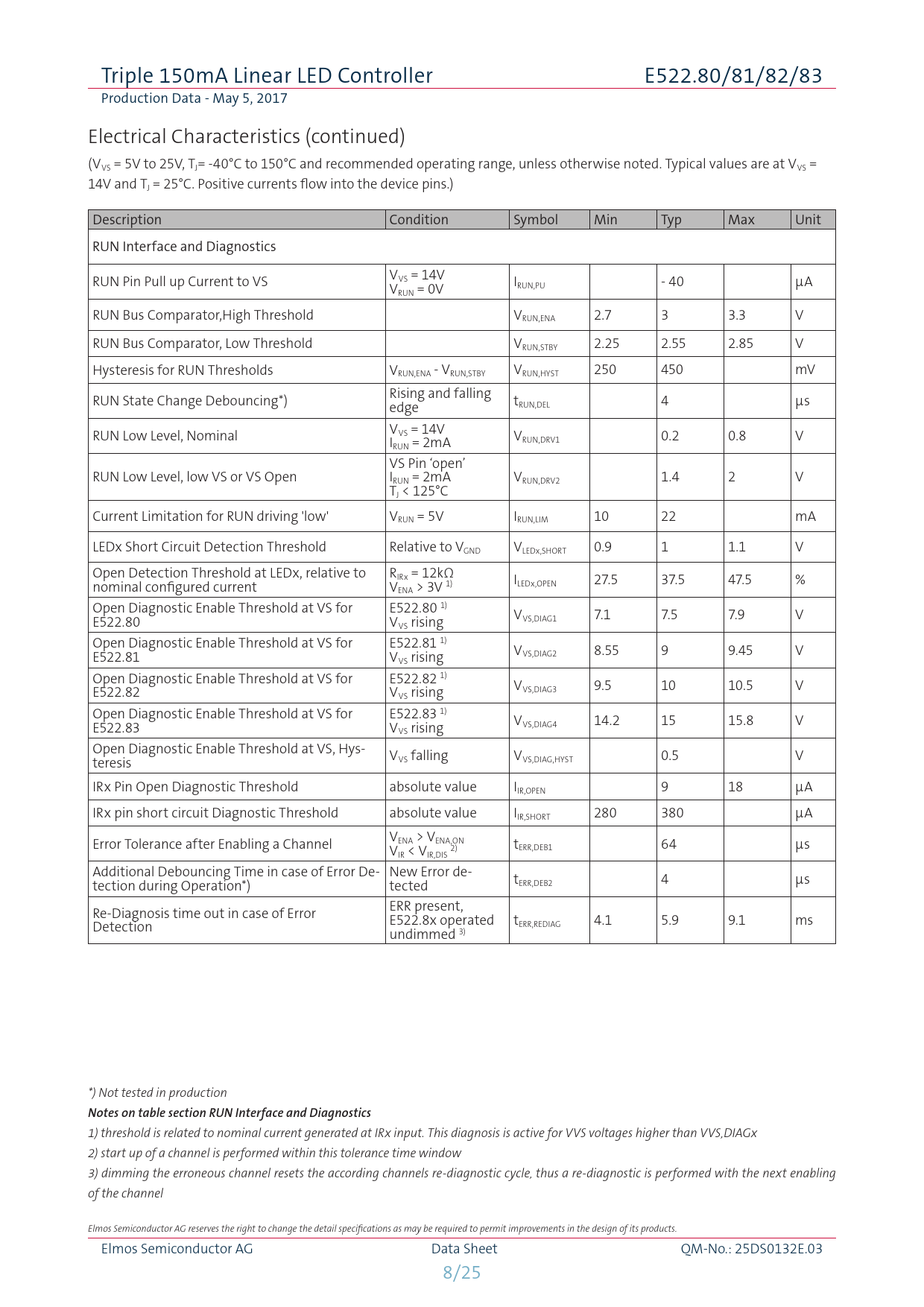 1) threshold is related to nominal current generated at IRx input. This diagnosis is active for VVS voltages higher than VVS,DIAGx 2) start up of a channel is performed within this tolerance time window 3) dimming the erroneous channel resets the according channels re-diagnostic cycle, thus a re-diagnostic is performed with the next enabling of the channel Elmos Semiconductor AG reserves the right to change the detail specifications as may be required to permit improvements in the design of its products. Elmos Semiconductor AG Data Sheet QM-No.: 25DS0132E.03 8/25