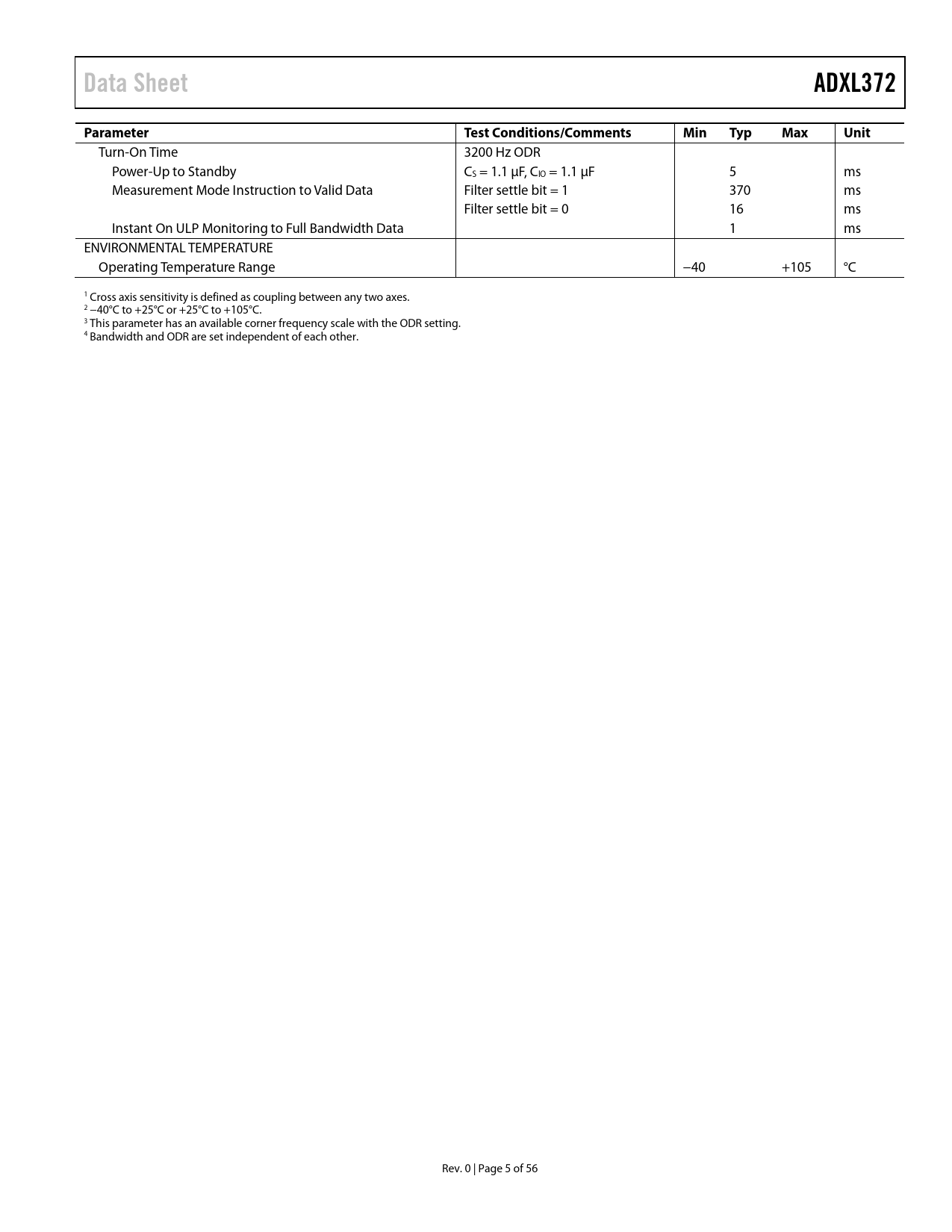 Data SheetADXL372ParameterTest Conditions/CommentsMinTypMaxUnit Turn-On Time 3200 Hz ODR Power-Up to Standby CS = 1.1 µF, CIO = 1.1 µF 5 ms Measurement Mode Instruction to Valid Data Filter settle bit = 1 370 ms Filter settle bit = 0 16 ms Instant On ULP Monitoring to Full Bandwidth Data 1 ms ENVIRONMENTAL TEMPERATURE Operating Temperature Range −40 +105 °C 1 Cross axis sensitivity is defined as coupling between any two axes. 2 −40°C to +25°C or +25°C to +105°C. 3 This parameter has an available corner frequency scale with the ODR setting. 4 Bandwidth and ODR are set independent of each other. Rev. 0 | Page 5 of 56 Document Outline FEATURES APPLICATIONS GENERAL DESCRIPTION FUNCTIONAL BLOCK DIAGRAM TABLE OF CONTENTS REVISION HISTORY SPECIFICATIONS ABSOLUTE MAXIMUM RATINGS THERMAL RESISTANCE RECOMMENDED SOLDERING PROFILE ESD CAUTION PIN CONFIGURATION AND FUNCTION DESCRIPTIONS TYPICAL PERFORMANCE CHARACTERISTICS THEORY OF OPERATION MECHANICAL DEVICE OPERATION OPERATING MODES Measurement Mode Instant On Mode Wake-Up Mode Standby BANDWIDTH Low-Pass Antialiasing Filter High-Pass Filter Filter Settling Time Selectable ODR POWER/NOISE TRADE-OFF POWER SAVINGS AUTONOMOUS EVENT DETECTION ACTIVITY AND INACTIVITY Low-Pass Activity Detect Filter Activity Detection Referenced and Absolute Configurations Activity Timer Activity Detection in Wake-Up Mode Inactivity Detection Referenced and Absolute Configurations Inactivity Timer Linking Activity and Inactivity Detection Default Mode Linked Mode Loop Mode Autosleep Using the AWAKE Bit MOTION WARNING IMPACT DETECTION FEATURES WIDE BANDWIDTH INSTANT ON IMPACT DETECTION CAPTURING IMPACT EVENTS FIFO BENEFITS OF THE FIFO System Level Power Savings Data Recording/Event Context USING THE FIFO FIFO Disabled Oldest Saved Mode (First N) Stream Mode (Last N) Triggered Mode RETRIEVING DATA FROM FIFO INTERRUPTS INTERRUPT PINS Alternate Functions TYPES OF INTERRUPTS Activity and Inactivity Interrupts Data Ready Interrupt FIFO Interrupts FIFO Watermark FIFO Ready Overrun ADDITIONAL FEATURES USING AN EXTERNAL CLOCK SYNCHRONIZED DATA SAMPLING SELF TEST Self Test Procedure USER REGISTER PROTECTION USER OFFSET TRIMS SERIAL COMMUNICATIONS SERIAL INTERFACE SPI Protocol I2C Protocol MULTIBYTE TRANSFERS INVALID ADDRESSES AND ADDRESS FOLDING SPI Timing Diagrams I2C Timing Diagrams REGISTER MAP REGISTER DETAILS ANALOG DEVICES ID REGISTER ANALOG DEVICES MEMS ID REGISTER DEVICE ID REGISTER PRODUCT REVISION ID REGISTER STATUS REGISTER ACTIVITY STATUS REGISTER FIFO ENTRIES REGISTER, MSB FIFO ENTRIES REGISTER, LSB X-AXIS DATA REGISTER, MSB X-AXIS DATA REGISTER, LSB Y-AXIS DATA REGISTER, MSB Y-AXIS DATA REGISTER, LSB Z-AXIS DATA REGISTER, MSB Z-AXIS DATA REGISTER, LSB HIGHEST PEAK DATA REGISTERS X-AXIS HIGHEST PEAK DATA REGISTER, MSB X-AXIS HIGHEST PEAK DATA REGISTER, LSB Y-AXIS HIGHEST PEAK DATA REGISTER, MSB Y-AXIS HIGHEST PEAK DATA REGISTER, LSB Z-AXIS HIGHEST PEAK DATA REGISTER, MSB Z-AXIS HIGHEST PEAK DATA REGISTER, LSB OFFSET TRIM REGISTERS X-AXIS OFFSET TRIM REGISTER, LSB Y-AXIS OFFSET TRIM REGISTER, LSB Z-AXIS OFFSET TRIM REGISTER, LSB X-AXIS ACTIVITY THRESHOLD REGISTER, MSB X-AXIS OF ACTIVITY THRESHOLD REGISTER, LSB Y-AXIS ACTIVITY THRESHOLD REGISTER, MSB Y-AXIS OF ACTIVITY THRESHOLD REGISTER, LSB Z-AXIS ACTIVITY THRESHOLD REGISTER, MSB Z-AXIS OF ACTIVITY THRESHOLD REGISTER, LSB ACTIVITY TIME REGISTER X-AXIS INACTIVITY THRESHOLD REGISTER, MSB X-AXIS OF INACTIVITY THRESHOLD REGISTER, LSB Y-AXIS INACTIVITY THRESHOLD REGISTER, MSB Y-AXIS OF INACTIVITY THRESHOLD REGISTER, LSB Z-AXIS INACTIVITY THRESHOLD REGISTER, MSB Z-AXIS OF INACTIVITY THRESHOLD REGISTER, LSB INACTIVITY TIME REGISTERS INACTIVITY TIMER REGISTER, MSB INACTIVITY TIMER REGISTER, LSB X-AXIS MOTION WARNING THRESHOLD REGISTER, MSB X-AXIS OF MOTION WARNING NOTIFICATION REGISTER, LSB Y-AXIS MOTION WARNING NOTIFICATION THRESHOLD REGISTER, MSB Y-AXIS OF MOTION WARNING NOTIFICATION REGISTER, LSB Z-AXIS MOTION WARNING NOTIFICATION THRESHOLD REGISTER, MSB Z-AXIS MOTION WARNING NOTIFICATION REGISTER, LSB HIGH-PASS FILTER SETTINGS REGISTER FIFO SAMPLES REGISTER FIFO CONTROL REGISTER INTERRUPT PIN FUNCTION MAP REGISTERS INT2 FUNCTION MAP REGISTER EXTERNAL TIMING CONTROL REGISTER MEASUREMENT CONTROL REGISTER POWER CONTROL REGISTER SELF TEST REGISTER RESET (CLEARS) REGISTER, PART IN STANDBY MODE FIFO ACCESS REGISTER APPLICATIONS INFORMATION APPLICATION EXAMPLES Power Supply Decoupling Using External Timing Triggers OPERATION AT VOLTAGES OTHER THAN 2.5 V OPERATION AT TEMPERATURES OTHER THAN AMBIENT MECHANICAL CONSIDERATIONS FOR MOUNTING AXES OF ACCELERATION SENSITIVITY LAYOUT AND DESIGN RECOMMENDATIONS OUTLINE DIMENSIONS ORDERING GUIDE
