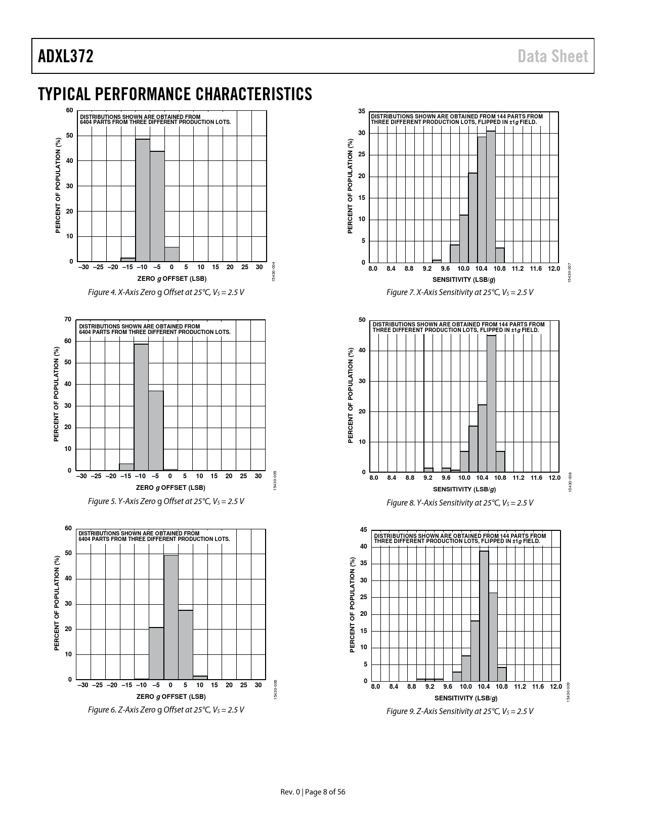 ADXL372Data SheetTYPICAL PERFORMANCE CHARACTERISTICS6035DISTRIBUTIONS SHOWN ARE OBTAINED FROMDISTRIBUTIONS SHOWN ARE OBTAINED FROM 144 PARTS FROM6404 PARTS FROM THREE DIFFERENT PRODUCTION LOTS.THREE DIFFERENT PRODUCTION LOTS, FLIPPED IN ±1gFIELD.5030))%%((2540TIONTIONA LA L20PUPU30POPOFF15OOTT20ENENCC10PERPER10500–30 –25 –20 –15 –10–5051015202530 004 8.08.48.89.29.610.0 10.410.811.211.612.0 007 ZERO gOFFSET (LSB) 15430- SENSITIVITY (LSB/g) 15430- Figure 4. X-Axis Zero g Offset at 25°C, VS = 2.5 V Figure 7. X-Axis Sensitivity at 25°C, VS = 2.5 V 7050DISTRIBUTIONS SHOWN ARE OBTAINED FROMDISTRIBUTIONS SHOWN ARE OBTAINED FROM 144 PARTS FROM6404 PARTS FROM THREE DIFFERENT PRODUCTION LOTS.THREE DIFFERENT PRODUCTION LOTS, FLIPPED IN ±1gFIELD.60))%40(% (50TION ATIONLA L3040PUPUPOPOF30FO TO20TENENC20CPERPER101000–30 –25 –20 –15 –10–5051015202530 005 8.08.48.89.29.610.0 10.4 10.811.211.612.0 008 ZERO gOFFSET (LSB) 15430- SENSITIVITY (LSB/g) 15430- Figure 5. Y-Axis Zero g Offset at 25°C, VS = 2.5 V Figure 8. Y-Axis Sensitivity at 25°C, VS = 2.5 V 6045DISTRIBUTIONS SHOWN ARE OBTAINED FROMDISTRIBUTIONS SHOWN ARE OBTAINED FROM 144 PARTS FROM6404 PARTS FROM THREE DIFFERENT PRODUCTION LOTS.THREE DIFFERENT PRODUCTION LOTS, FLIPPED IN ±1gFIELD.4050))% (% 35(40TION30ATIONLA LPU25PU30PO FPO F 20O TO T20EN15CEN CPER10PER10500–30 –25 –20 –15 –10–5051015202530 006 8.08.48.89.29.610.0 10.4 10.811.211.612.0 009 ZERO gOFFSET (LSB) 15430- SENSITIVITY (LSB/g) 15430- Figure 6. Z-Axis Zero g Offset at 25°C, VS = 2.5 V Figure 9. Z-Axis Sensitivity at 25°C, VS = 2.5 V Rev. 0 | Page 8 of 56 Document Outline FEATURES APPLICATIONS GENERAL DESCRIPTION FUNCTIONAL BLOCK DIAGRAM TABLE OF CONTENTS REVISION HISTORY SPECIFICATIONS ABSOLUTE MAXIMUM RATINGS THERMAL RESISTANCE RECOMMENDED SOLDERING PROFILE ESD CAUTION PIN CONFIGURATION AND FUNCTION DESCRIPTIONS TYPICAL PERFORMANCE CHARACTERISTICS THEORY OF OPERATION MECHANICAL DEVICE OPERATION OPERATING MODES Measurement Mode Instant On Mode Wake-Up Mode Standby BANDWIDTH Low-Pass Antialiasing Filter High-Pass Filter Filter Settling Time Selectable ODR POWER/NOISE TRADE-OFF POWER SAVINGS AUTONOMOUS EVENT DETECTION ACTIVITY AND INACTIVITY Low-Pass Activity Detect Filter Activity Detection Referenced and Absolute Configurations Activity Timer Activity Detection in Wake-Up Mode Inactivity Detection Referenced and Absolute Configurations Inactivity Timer Linking Activity and Inactivity Detection Default Mode Linked Mode Loop Mode Autosleep Using the AWAKE Bit MOTION WARNING IMPACT DETECTION FEATURES WIDE BANDWIDTH INSTANT ON IMPACT DETECTION CAPTURING IMPACT EVENTS FIFO BENEFITS OF THE FIFO System Level Power Savings Data Recording/Event Context USING THE FIFO FIFO Disabled Oldest Saved Mode (First N) Stream Mode (Last N) Triggered Mode RETRIEVING DATA FROM FIFO INTERRUPTS INTERRUPT PINS Alternate Functions TYPES OF INTERRUPTS Activity and Inactivity Interrupts Data Ready Interrupt FIFO Interrupts FIFO Watermark FIFO Ready Overrun ADDITIONAL FEATURES USING AN EXTERNAL CLOCK SYNCHRONIZED DATA SAMPLING SELF TEST Self Test Procedure USER REGISTER PROTECTION USER OFFSET TRIMS SERIAL COMMUNICATIONS SERIAL INTERFACE SPI Protocol I2C Protocol MULTIBYTE TRANSFERS INVALID ADDRESSES AND ADDRESS FOLDING SPI Timing Diagrams I2C Timing Diagrams REGISTER MAP REGISTER DETAILS ANALOG DEVICES ID REGISTER ANALOG DEVICES MEMS ID REGISTER DEVICE ID REGISTER PRODUCT REVISION ID REGISTER STATUS REGISTER ACTIVITY STATUS REGISTER FIFO ENTRIES REGISTER, MSB FIFO ENTRIES REGISTER, LSB X-AXIS DATA REGISTER, MSB X-AXIS DATA REGISTER, LSB Y-AXIS DATA REGISTER, MSB Y-AXIS DATA REGISTER, LSB Z-AXIS DATA REGISTER, MSB Z-AXIS DATA REGISTER, LSB HIGHEST PEAK DATA REGISTERS X-AXIS HIGHEST PEAK DATA REGISTER, MSB X-AXIS HIGHEST PEAK DATA REGISTER, LSB Y-AXIS HIGHEST PEAK DATA REGISTER, MSB Y-AXIS HIGHEST PEAK DATA REGISTER, LSB Z-AXIS HIGHEST PEAK DATA REGISTER, MSB Z-AXIS HIGHEST PEAK DATA REGISTER, LSB OFFSET TRIM REGISTERS X-AXIS OFFSET TRIM REGISTER, LSB Y-AXIS OFFSET TRIM REGISTER, LSB Z-AXIS OFFSET TRIM REGISTER, LSB X-AXIS ACTIVITY THRESHOLD REGISTER, MSB X-AXIS OF ACTIVITY THRESHOLD REGISTER, LSB Y-AXIS ACTIVITY THRESHOLD REGISTER, MSB Y-AXIS OF ACTIVITY THRESHOLD REGISTER, LSB Z-AXIS ACTIVITY THRESHOLD REGISTER, MSB Z-AXIS OF ACTIVITY THRESHOLD REGISTER, LSB ACTIVITY TIME REGISTER X-AXIS INACTIVITY THRESHOLD REGISTER, MSB X-AXIS OF INACTIVITY THRESHOLD REGISTER, LSB Y-AXIS INACTIVITY THRESHOLD REGISTER, MSB Y-AXIS OF INACTIVITY THRESHOLD REGISTER, LSB Z-AXIS INACTIVITY THRESHOLD REGISTER, MSB Z-AXIS OF INACTIVITY THRESHOLD REGISTER, LSB INACTIVITY TIME REGISTERS INACTIVITY TIMER REGISTER, MSB INACTIVITY TIMER REGISTER, LSB X-AXIS MOTION WARNING THRESHOLD REGISTER, MSB X-AXIS OF MOTION WARNING NOTIFICATION REGISTER, LSB Y-AXIS MOTION WARNING NOTIFICATION THRESHOLD REGISTER, MSB Y-AXIS OF MOTION WARNING NOTIFICATION REGISTER, LSB Z-AXIS MOTION WARNING NOTIFICATION THRESHOLD REGISTER, MSB Z-AXIS MOTION WARNING NOTIFICATION REGISTER, LSB HIGH-PASS FILTER SETTINGS REGISTER FIFO SAMPLES REGISTER FIFO CONTROL REGISTER INTERRUPT PIN FUNCTION MAP REGISTERS INT2 FUNCTION MAP REGISTER EXTERNAL TIMING CONTROL REGISTER MEASUREMENT CONTROL REGISTER POWER CONTROL REGISTER SELF TEST REGISTER RESET (CLEARS) REGISTER, PART IN STANDBY MODE FIFO ACCESS REGISTER APPLICATIONS INFORMATION APPLICATION EXAMPLES Power Supply Decoupling Using External Timing Triggers OPERATION AT VOLTAGES OTHER THAN 2.5 V OPERATION AT TEMPERATURES OTHER THAN AMBIENT MECHANICAL CONSIDERATIONS FOR MOUNTING AXES OF ACCELERATION SENSITIVITY LAYOUT AND DESIGN RECOMMENDATIONS OUTLINE DIMENSIONS ORDERING GUIDE