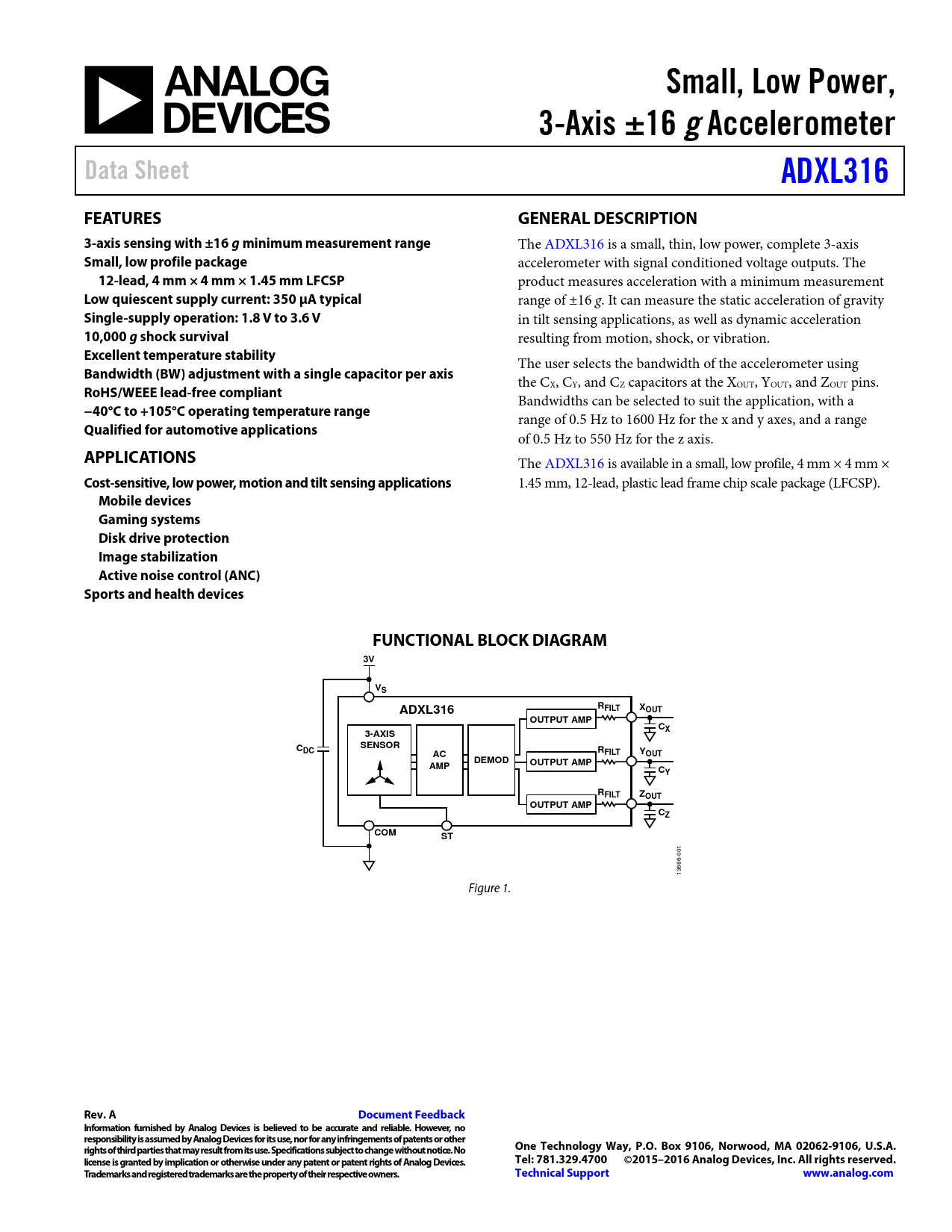 Mobile devices Gaming systems Disk drive protection Image stabilization Active noise control (ANC) Sports and health devices FUNCTIONAL BLOCK DIAGRAM 3V VS ADXL316 RFILT XOUT OUTPUT AMP CX 3-AXIS SENSOR CDC RFILT Y AC OUT DEMOD OUTPUT AMP AMP CY RFILT ZOUT OUTPUT AMP CZ COM ST