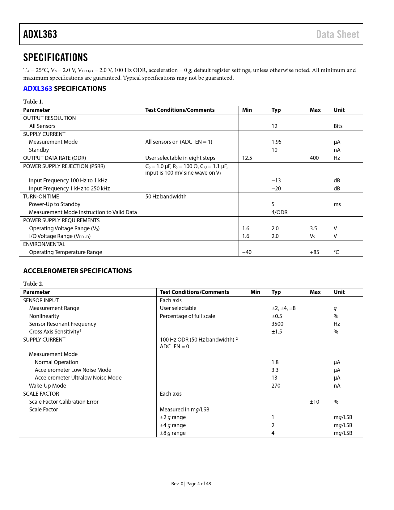 SENSOR INPUT Each axis Measurement Range User selectable ±2, ±4, ±8 g Nonlinearity Percentage of full scale ±0.5 % Sensor Resonant Frequency 3500 Hz Cross Axis Sensitivity1 ±1.5 % SUPPLY CURRENT 100 Hz ODR (50 Hz bandwidth) 2 ADC_EN = 0 Measurement Mode Normal Operation 1.8 µA Accelerometer Low Noise Mode 3.3 µA Accelerometer Ultralow Noise Mode 13 µA Wake-Up Mode 270 nA SCALE FACTOR Each axis Scale Factor Calibration Error ±10 % Scale Factor Measured in mg/LSB ±2 g range 1 mg/LSB ±4 g range 2 mg/LSB ±8 g range 4 mg/LSB Rev. 0 | Page 4 of 48 Document Outline Features Applications General Description Functional Block Diagram Revision History Specifications ADXL363 Specifications Accelerometer Specifications Temperature Sensor Specifications 12-Bit ADC Specifications Absolute Maximum Ratings Thermal Resistance Recommended Soldering Profile ESD Caution Pin Configuration and Function Descriptions Typical Performance Characteristics Theory of Operation Accelerometer Mechanical Device Operation Operating Modes Measurement Mode Wake-Up Mode Standby Selectable Measurement Ranges Selectable Output Data Rates Antialiasing Power/Noise Tradeoff Free Fall Detection ADC Analog Inputs Digital Output Temperature Sensor Power Savings Features Ultralow Power Consumption in All Modes, Operating All Sensors Motion Detection Activity Detection Referenced and Absolute Configurations Fewer False Positives Inactivity Detection Linking Activity and Inactivity Detection Default Mode Linked Mode Loop Mode Autosleep Using the Awake Bit FIFO System Level Power Savings Data Recording/Event Context Communications SPI Instructions Bus Keepers MSB Registers Additional Features External Clock Synchronized Data Sampling Self Test User Register Protection Serial Communications SPI Commands Read and Write Register Commands Read FIFO Command Multibyte Transfers Register Read/Write Auto-Increment Invalid Addresses and Address Folding Latency Restrictions Invalid Commands Register Map Register Details Device ID Registers Silicon Revision ID Register X-Axis Data (8 MSB) Register Y-Axis Data (8 MSB) Register Z-Axis Data (8 MSB) Register Status Register FIFO Entries Registers X-Axis Data Registers Y-Axis Data Registers Z-Axis Data Registers Temperature Data Registers ADC Data Registers Soft Reset Register Activity Threshold Registers Activity Time Register Inactivity Threshold Registers Inactivity Time Registers Activity/Inactivity Control Register FIFO Control Register FIFO Samples Register INT1/INT2 Function Map Registers Filter Control Register Power Control Register Self Test Register Applications Information Application Examples Device Configuration Autonomous Motion Switch Startup Routine Using External Timing Using an External Clock Using Synchronized Data Sampling How to Set Up Synchronized Data Sampling Power Power Supply Decoupling Power Supply Requirements FIFO Modes FIFO Disabled Oldest Saved Mode Stream Mode Triggered Mode FIFO Configuration FIFO Interrupts Retrieving Data from FIFO Interrupts Interrupt Pins Alternate Functions of Interrupt Pins Activity and Inactivity Interrupts Data Ready Interrupt Using FIFO Interrupts FIFO Watermark FIFO Ready Overrun Using Self Test Operation at Voltages Other Than 2.0 V Mechanical Considerations for Mounting Axes of Acceleration Sensitivity Layout and Design Recommendations Outline Dimensions Ordering Guide