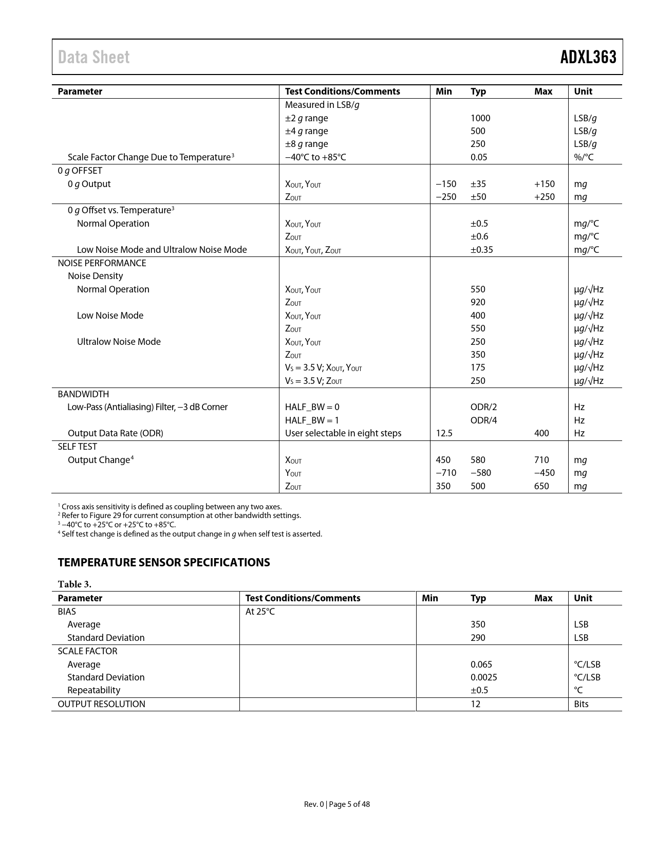 Data Sheet ADXL363 Parameter Test Conditions/Comments Min Typ Max Unit TEMPERATURE SENSOR SPECIFICATIONS Table 3 Parameter