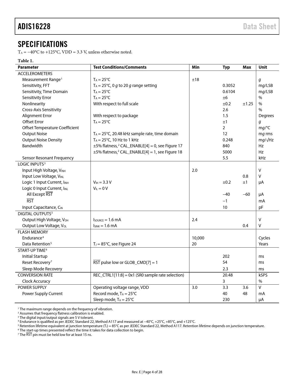 link to page 16 link to page 16 link to page 27 ADIS16228Data SheetSPECIFICATIONS TA = −40°C to +125°C, VDD = 3.3 V, unless otherwise noted. Table 1. ParameterTest Conditions/CommentsMinTypMaxUnit ACCELEROMETERS Measurement Range1 TA = 25°C ±18 g Sensitivity, FFT TA = 25°C, 0 g to 20 g range setting 0.3052 mg/LSB Sensitivity, Time Domain TA = 25°C 0.6104 mg/LSB Sensitivity Error TA = 25°C ±6 % Nonlinearity With respect to full scale ±0.2 ±1.25 % Cross-Axis Sensitivity 2.6 % Alignment Error With respect to package 1.5 Degrees Offset Error TA = 25°C ±1 g Offset Temperature Coefficient 2 mg/°C Output Noise TA = 25°C, 20.48 kHz sample rate, time domain 12 mg rms Output Noise Density TA = 25°C, 10 Hz to 1 kHz 0.248 mg/√Hz Bandwidth ±5% flatness,2 CAL_ENABLE[4] = 0, see Figure 17 840 Hz ±5% flatness,2 CAL_ENABLE[4] = 1, see Figure 18 5000 Hz Sensor Resonant Frequency 5.5 kHz LOGIC INPUTS3 Input High Voltage, VINH 2.0 V Input Low Voltage, VINL 0.8 V Logic 1 Input Current, IINH VIH = 3.3 V ±0.2 ±1 µA Logic 0 Input Current, IINL VIL = 0 V All Except RST −40 −60 µA RST −1 mA Input Capacitance, CIN 10 pF DIGITAL OUTPUTS3 Output High Voltage, VOH ISOURCE = 1.6 mA 2.4 V Output Low Voltage, VOL ISINK = 1.6 mA 0.4 V FLASH MEMORY Endurance4 10,000 Cycles Data Retention5 TJ = 85°C, see Figure 24 20 Years START-UP TIME6 Initial Startup 202 ms Reset Recovery7 RST pulse low or GLOB_CMD[7] = 1 54 ms Sleep Mode Recovery 2.3 ms CONVERSION RATE REC_CTRL1[11:8] = 0x1 (SR0 sample rate selection) 20.48 kSPS Clock Accuracy 3 % POWER SUPPLY Operating voltage range, VDD 3.0 3.3 3.6 V Power Supply Current Record mode, TA = 25°C 40 48 mA Sleep mode, TA = 25°C 230 µA 1 The maximum range depends on the frequency of vibration. 2 Assumes that frequency flatness calibration is enabled. 3 The digital input/output signals are 5 V tolerant. 4 Endurance is qualified as per JEDEC Standard 22, Method A117 and measured at −40°C, +25°C, +85°C, and +125°C. 5 Retention lifetime equivalent at junction temperature (TJ) = 85°C as per JEDEC Standard 22, Method A117. Retention lifetime depends on junction temperature. 6 The start-up times presented reflect the time it takes for data collection to begin. 7 The RST pin must be held low for at least 15 ns. Rev. E | Page 4 of 28 Document Outline FEATURES APPLICATIONS GENERAL DESCRIPTION FUNCTIONAL BLOCK DIAGRAM TABLE OF CONTENTS REVISION HISTORY SPECIFICATIONS TIMING SPECIFICATIONS Timing Diagrams ABSOLUTE MAXIMUM RATINGS ESD CAUTION PIN CONFIGURATION AND FUNCTION DESCRIPTIONS THEORY OF OPERATION SENSING ELEMENT SIGNAL PROCESSING USER INTERFACE SPI Interface Dual-Memory Structure BASIC OPERATION SPI WRITE COMMANDS SPI READ COMMANDS DATA RECORDING AND SIGNAL PROCESSING RECORDING MODE Manual FFT Mode Automatic FFT Mode Manual Time Capture Mode Real-Time Mode SPECTRAL RECORD PRODUCTION SAMPLE RATE/FILTERING DYNAMIC RANGE/SENSITIVITY Frequency Response Correction Axial Definitions Dynamic Range Settings Scale Adjustment PRE-FFT WINDOWING FFT FFT Averaging RECORDING TIMES DATA RECORDS FFT RECORD FLASH ENDURANCE SPECTRAL ALARMS ALARM DEFINITION Alarm Band Frequency Definitions Alarm Trigger Settings Enable Alarm Settings ALARM INDICATOR SIGNALS ALARM FLAGS AND CONDITIONS ALARM STATUS WORST-CASE CONDITION MONITORING READING OUTPUT DATA READING DATA FROM THE DATA BUFFER ACCESSING FFT RECORD DATA DATA FORMAT REAL-TIME DATA COLLECTION POWER SUPPLY/TEMPERATURE FFT EVENT HEADER SYSTEM TOOLS GLOBAL COMMANDS STATUS/ERROR FLAGS POWER-DOWN OPERATION MANAGMENT Software Busy Indicator Software Escape Code INPUT/OUTPUT FUNCTIONS Busy Indicator Trigger Input Alarm Indicator General-Purpose Input/Output SELF-TEST FLASH MEMORY MANAGEMENT DEVICE IDENTIFICATION APPLICATIONS INFORMATION INTERFACE BOARD FLEX CONNECTOR CARE MATING CONNECTOR OUTLINE DIMENSIONS ORDERING GUIDE