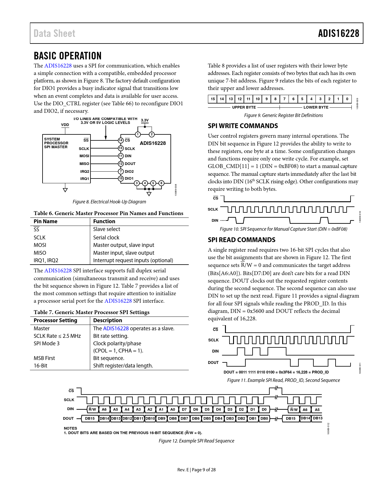link to page 10 link to page 26 link to page 10 link to page 10 link to page 11 link to page 10 link to page 10 link to page 10 link to page 10 Data SheetADIS16228BASIC OPERATION The ADIS16228 uses a SPI for communication, which enables Table 8 provides a list of user registers with their lower byte a simple connection with a compatible, embedded processor addresses. Each register consists of two bytes that each has its own platform, as shown in Figure 8. The factory default configuration unique 7-bit address. Figure 9 relates the bits of each register to for DIO1 provides a busy indicator signal that transitions low their upper and lower addresses. when an event completes and data is available for user access. 1514131211109876543210 Use the DIO_CTRL register (see Table 66) to reconfigure DIO1 009 and DIO2, if necessary. UPPER BYTELOWER BYTE 10069- Figure 9. Generic Register Bit Definitions I/O LINES ARE COMPATIBLE WITH3.3V3.3V OR 5V LOGIC LEVELSVDDSPI WRITE COMMANDS12 User control registers govern many internal operations. The SYSTEMSS14 CSPROCESSORADIS16228 DIN bit sequence in Figure 12 provides the ability to write to SPI MASTERSCLK13 SCLK these registers, one byte at a time. Some configuration changes MOSI11 DIN and functions require only one write cycle. For example, set MISO12 DOUT GLOB_CMD[11] = 1 (DIN = 0xBF08) to start a manual capture IRQ27DIO2 sequence. The manual capture starts immediately after the last bit IRQ115 DIO1 clocks into DIN (16th SCLK rising edge). Other configurations may 3458 008 require writing to both bytes. 10069- CS Figure 8. Electrical Hook-Up Diagram SCLKTable 6. Generic Master Processor Pin Names and Functions 010 Pin NameFunctionDIN 10069- SS Slave select Figure 10. SPI Sequence for Manual Capture Start (DIN = 0xBF08) SCLK Serial clock SPI READ COMMANDS MOSI Master output, slave input MISO Master input, slave output A single register read requires two 16-bit SPI cycles that also IRQ1, IRQ2 Interrupt request inputs (optional) use the bit assignments that are shown in Figure 12. The first sequence sets R/W = 0 and communicates the target address The ADIS16228 SPI interface supports full duplex serial (Bits[A6:A0]). Bits[D7:D0] are don’t care bits for a read DIN communication (simultaneous transmit and receive) and uses sequence. DOUT clocks out the requested register contents the bit sequence shown in Figure 12. Table 7 provides a list of during the second sequence. The second sequence can also use the most common settings that require attention to initialize DIN to set up the next read. Figure 11 provides a signal diagram a processor serial port for the ADIS16228 SPI interface. for all four SPI signals while reading the PROD_ID. In this Table 7. Generic Master Processor SPI Settings diagram, DIN = 0x5600 and DOUT reflects the decimal Processor SettingDescription equivalent of 16,228. Master The ADIS16228 operates as a slave. CS SCLK Rate ≤ 2.5 MHz Bit rate setting. SPI Mode 3 Clock polarity/phase SCLK (CPOL = 1, CPHA = 1). DIN MSB First Bit sequence. 16-Bit Shift register/data length. DOUT 1 1 0 DOUT = 0011 1111 0110 0100 = 0x3F64 = 16,228 = PROD_ID 10069- Figure 11. Example SPI Read, PROD_ID, Second Sequence CSSCLKDINR/WA6A5A4A3A2A1A0D7D6D5D4D3D2D1D0R/WA6A5DOUTDB15DB14 DB13 DB12 DB11 DB10 DB9DB8DB7DB6DB5DB4DB3DB2DB1DB0DB15DB14 DB13 012 NOTES 1. DOUT BITS ARE BASED ON THE PREVIOUS 16-BIT SEQUENCE (R/W = 0). 10069- Figure 12. Example SPI Read Sequence Rev. E | Page 9 of 28 Document Outline FEATURES APPLICATIONS GENERAL DESCRIPTION FUNCTIONAL BLOCK DIAGRAM TABLE OF CONTENTS REVISION HISTORY SPECIFICATIONS TIMING SPECIFICATIONS Timing Diagrams ABSOLUTE MAXIMUM RATINGS ESD CAUTION PIN CONFIGURATION AND FUNCTION DESCRIPTIONS THEORY OF OPERATION SENSING ELEMENT SIGNAL PROCESSING USER INTERFACE SPI Interface Dual-Memory Structure BASIC OPERATION SPI WRITE COMMANDS SPI READ COMMANDS DATA RECORDING AND SIGNAL PROCESSING RECORDING MODE Manual FFT Mode Automatic FFT Mode Manual Time Capture Mode Real-Time Mode SPECTRAL RECORD PRODUCTION SAMPLE RATE/FILTERING DYNAMIC RANGE/SENSITIVITY Frequency Response Correction Axial Definitions Dynamic Range Settings Scale Adjustment PRE-FFT WINDOWING FFT FFT Averaging RECORDING TIMES DATA RECORDS FFT RECORD FLASH ENDURANCE SPECTRAL ALARMS ALARM DEFINITION Alarm Band Frequency Definitions Alarm Trigger Settings Enable Alarm Settings ALARM INDICATOR SIGNALS ALARM FLAGS AND CONDITIONS ALARM STATUS WORST-CASE CONDITION MONITORING READING OUTPUT DATA READING DATA FROM THE DATA BUFFER ACCESSING FFT RECORD DATA DATA FORMAT REAL-TIME DATA COLLECTION POWER SUPPLY/TEMPERATURE FFT EVENT HEADER SYSTEM TOOLS GLOBAL COMMANDS STATUS/ERROR FLAGS POWER-DOWN OPERATION MANAGMENT Software Busy Indicator Software Escape Code INPUT/OUTPUT FUNCTIONS Busy Indicator Trigger Input Alarm Indicator General-Purpose Input/Output SELF-TEST FLASH MEMORY MANAGEMENT DEVICE IDENTIFICATION APPLICATIONS INFORMATION INTERFACE BOARD FLEX CONNECTOR CARE MATING CONNECTOR OUTLINE DIMENSIONS ORDERING GUIDE