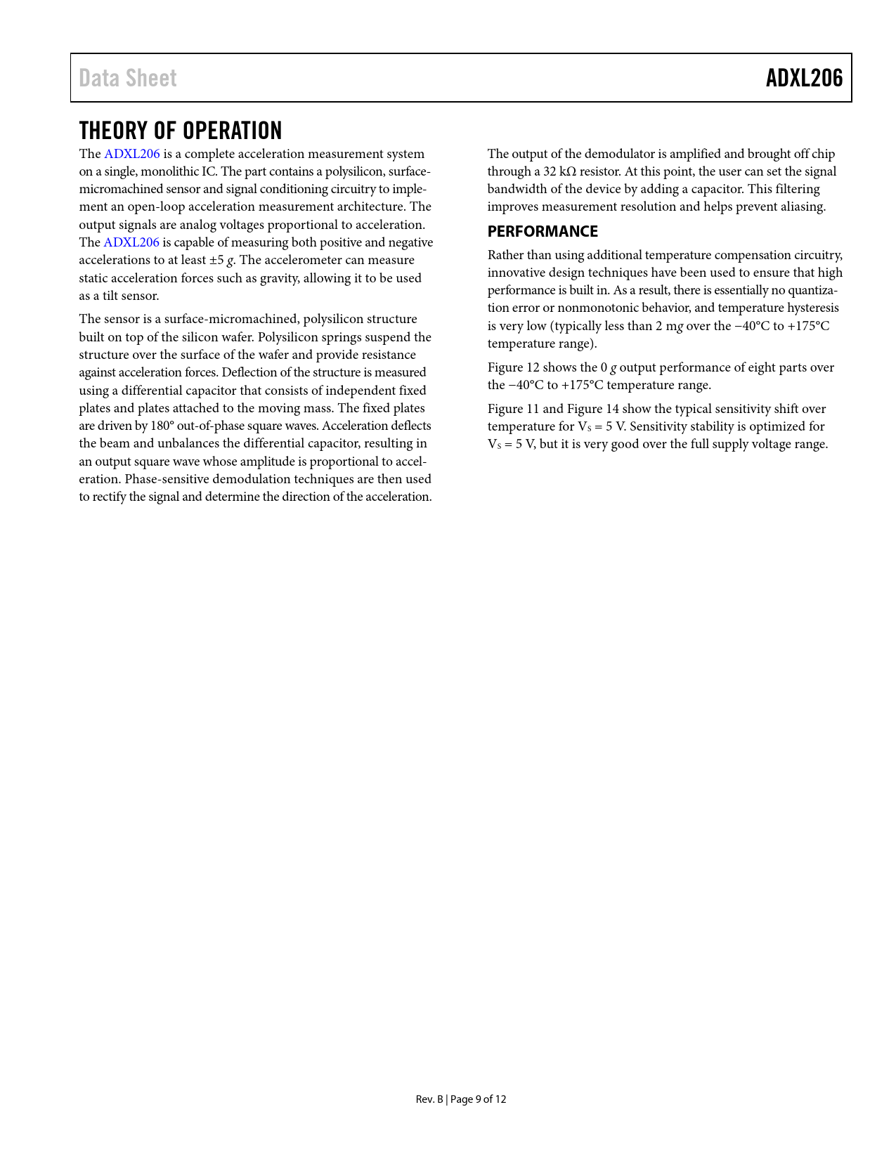 link to page 8 link to page 8 link to page 8 Data SheetADXL206THEORY OF OPERATION The ADXL206 is a complete acceleration measurement system The output of the demodulator is amplified and brought off chip on a single, monolithic IC. The part contains a polysilicon, surface- through a 32 kΩ resistor. At this point, the user can set the signal micromachined sensor and signal conditioning circuitry to imple- bandwidth of the device by adding a capacitor. This filtering ment an open-loop acceleration measurement architecture. The improves measurement resolution and helps prevent aliasing. output signals are analog voltages proportional to acceleration. PERFORMANCE The ADXL206 is capable of measuring both positive and negative accelerations to at least ±5 g. The accelerometer can measure Rather than using additional temperature compensation circuitry, static acceleration forces such as gravity, allowing it to be used innovative design techniques have been used to ensure that high as a tilt sensor. performance is built in. As a result, there is essentially no quantiza- tion error or nonmonotonic behavior, and temperature hysteresis The sensor is a surface-micromachined, polysilicon structure is very low (typically less than 2 mg over the −40°C to +175°C built on top of the silicon wafer. Polysilicon springs suspend the temperature range). structure over the surface of the wafer and provide resistance against acceleration forces. Deflection of the structure is measured Figure 12 shows the 0 g output performance of eight parts over using a differential capacitor that consists of independent fixed the −40°C to +175°C temperature range. plates and plates attached to the moving mass. The fixed plates Figure 11 and Figure 14 show the typical sensitivity shift over are driven by 180° out-of-phase square waves. Acceleration deflects temperature for VS = 5 V. Sensitivity stability is optimized for the beam and unbalances the differential capacitor, resulting in VS = 5 V, but it is very good over the full supply voltage range. an output square wave whose amplitude is proportional to accel- eration. Phase-sensitive demodulation techniques are then used to rectify the signal and determine the direction of the acceleration. Rev. B | Page 9 of 12 Document Outline FEATURES APPLICATIONS GENERAL DESCRIPTION FUNCTIONAL BLOCK DIAGRAM TABLE OF CONTENTS REVISION HISTORY SPECIFICATIONS ABSOLUTE MAXIMUM RATINGS THERMAL RESISTANCE ESD CAUTION PIN CONFIGURATION AND FUNCTION DESCRIPTIONS TYPICAL PERFORMANCE CHARACTERISTICS THEORY OF OPERATION PERFORMANCE APPLICATIONS INFORMATION POWER SUPPLY DECOUPLING SETTING THE BANDWIDTH USING CX AND CY SELF-TEST DESIGN TRADE-OFFS FOR SELECTING FILTER CHARACTERISTICS: NOISE/BANDWIDTH TRADE-OFF USING THE ADXL206 WITH OPERATING VOLTAGES OTHER THAN 5 V USING THE ADXL206 AS A DUAL-AXIS TILT SENSOR Dual-Axis Tilt Sensor: Converting Acceleration to Tilt OUTLINE DIMENSIONS ORDERING GUIDE